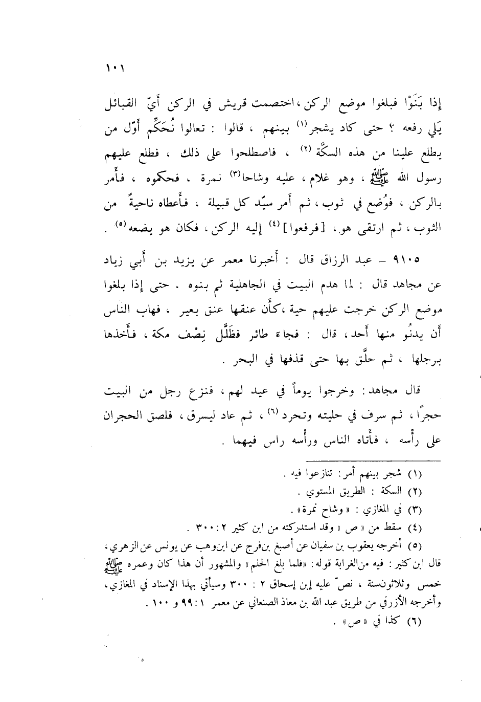 ٩١٠٥ - قَالَ: أَخْبَرَنَا مَعْمَرٌ، عَنْ يَزِيدَ بْنِ أَبِي زِيَادٍ، عَنْ مُجَاهِدٍ قَالَ: " لَمَّا هُدِمَ الْبَيْتُ فِي الْجَاهِلِيَّةِ، ثُمَّ بَنَوْهُ حَتَّى إِذَا بَلَغُوا مَوْضِعَ الرُّكْنِ، خَرَجَتْ عَلَيْهِمْ حَيَّةٌ كَأنَ عُنُقَهَا عُنُقَ بَعِيرٍ، فَهَابَ النَّاسُ أَنْ يَدْنُوَ مِنْهَا أَحَدٌ قَالَ: فَجَاءَ طَائِرٌ فَظَلَّلَ نَصْفَ مَكَّةَ فَأَخَذَهَا بِرِجْلِهَا، ثُمَّ حَلَّقَ بِهَا حَتَّى قَذَفَهَا فِي الْبَحْرِ " قَالَ مُجَاهِدٌ: «وَخَرَجُوا يَوْمًا فِي عِيدٍ لَهُمْ فَنَزَعَ رَجُلٌ مِنَ الْبَيْتِ حَجَرًا، ثُمَّ سَرَقَ مِنْ حِلْيَتِهِ وَتَحَرَّدَ، ثُمَّ عَادَ لِيَسْرِقَ، فَلَصَقَ الْحَجَرَانِ عَلَى رَأْسِهِ، فَأَتَاهُ النَّاسُ وَرَأْسُهُ رَاسٍ فِيهِمَا»