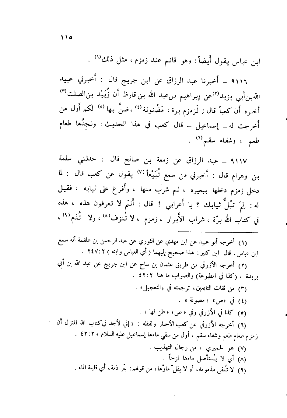 ٩١١٦ - أَخْبَرَنَا عَبْدُ الرَّزَّاقِ، عَنِ ابْنِ جُرَيْجٍ قَالَ: أَخْبَرَنِي عُبَيْدُ اللَّهِ بْنُ أَبِي يَزِيدَ، عَنْ إِبْرَاهِيمَ بْنِ عَبْدِ اللَّهِ بْنِ قَارِظٍ، أَنَّ زُيَيْدَ بْنَ الصَّلْتِ أَخْبَرَهُ، أَنَّ كَعْبًا قَالَ لِزَمْزَمَ: «بَرَّةٌ، مَضْنُونَةٌ، ضُنَّ بِهَا لَكُمْ أَوَّلُ مَنْ أَخْرَجَتْ لَهُ - إِسْمَاعِيلُ -» قَالَ كَعْبٌ فِي هَذَا الْحَدِيثِ: «وَنَجِدُهَا طَعَامَ طُعْمٍ، وَشِفَاءَ سَقَمٍ»