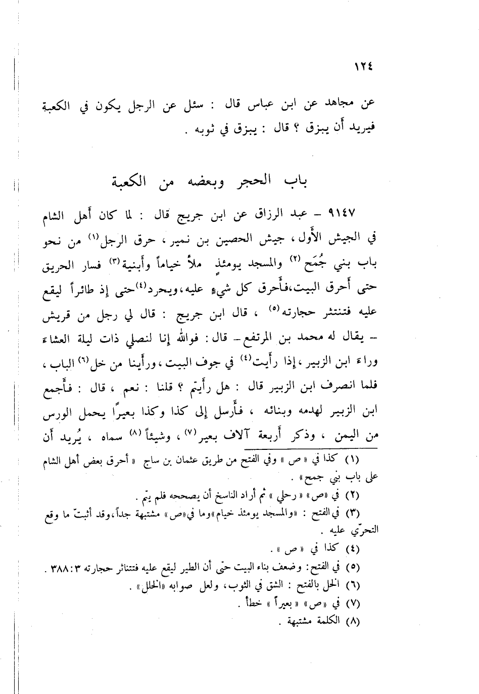 ٩١٤٧ - عَنِ ابْنِ جُرَيْجٍ قَالَ: لَمَّا كَانَ أَهْلُ الشَّامِ فِي الْجَيْشِ الْأَوَّلِ جَيْشِ الْحُصَيْنِ بْنِ نُمَيْرٍ حَرَقَ الرَّجُلُ مِنْ نَحْوِ بَابِ بَنِي جُمَحٍ وَالْمَسْجِدُ يَوْمَئِذٍ مَلَآنُ خِيَامًا وَأَبْنِيَةً، فَسَارَ الْحَرِيقُ حَتَّى أَحْرَقَ الْبَيْتَ، فَأَحَرَقَ كُلَّ شَيْءٍ عَلَيْهِ وَيَحْرِدُ حَتَّى إِذْ طَائِرًا لَيَقَعُ عَلَيْهِ فَتَنْتَثِرُ حِجَارَتُهُ، قَالَ ابْنُ جُرَيْجٍ: قَالَ لِي رَجُلٌ مِنْ قُرَيْشٍ يُقَالُ لَهُ مُحَمَّدُ بْنُ الْمُرْتَفِعِ قَالَ: " فَوَاللَّهِ إِنَّا لَنُصَلِّي ذَاتَ لَيْلَةٍ الْعِشَاءَ وَرَاءَ ابْنِ الزُّبَيْرِ، إِذَا رَأَيْتُ فِي جَوْفِ الْبَيْتِ وَرَأَيْنَا مِنْ خَلِّ الْبَابِ، فَلَمَّا انْصَرَفَ ابْنُ الزُّبَيْرِ قَالَ: هَلْ رَأَيْتُمْ؟ قُلْنَا: نَعَمْ قَالَ: فَأَجْمَعَ ابْنُ الزُّبَيْرِ لِهَدْمِهِ وَبِنَائِهِ، فَأَرْسَلَ إِلَيَّ كَذَا وَكَذَا بَعِيرًا يَحْمِلُ الْوَرْسَ مِنَ الْيَمَنِ، - وَذَكَرَ أَرْبَعَةَ آلَافِ بَعِيرٍ، وَشَيْئًا سَمَّاهُ -، يُرِيدُ أَنْ ⦗١٢٥⦘ يَجْعَلَهُ مَدَرًا لِلْبَيْتِ، ثُمَّ قِيلَ لَهُ إِنَّ الْوَرْسَ يَعْفُنُ وَيَرْفُتُ، فَقَسَّمَ الْوَرْسَ فِي نِسَاءِ قُرَيْشٍ وَقَوَاعِدِهِنَّ، وَبَنَى بِالْقَصَّةِ فَأَرْسَلَ إِلَيْهِ ابْنُ عَبَّاسٍ لَمَّا أَحْضَرَ حَاجَتَهُ: إِنْ كُنْتَ فَاعِلًا فَلَا تَدَعِ النَّاسَ لَا قِبْلَةَ لَهُمْ، اجْعَلْ عَلَى زَوَايَاهَا صَوَارِيَ، وَاجْعَلْ عَلَيْهَا سُتُورًا يُصَلِّي النَّاسُ إِلَيْهَا، فَفَعَلَ حَتَّى إِذَا كَانَ يَوْمُ الْأَحَدِ، صَعِدَ عَلَى الْمِنْبَرِ ثُمَّ قَالَ: يَا أَيُّهَا النَّاسُ، مَا تَرَوْنَ فِي هَدْمِ الْبَيْتِ، فَلَمْ يَخْتَلِفَ عَلَيْهِ أَحَدٌ، فَقَالُوا: نَرَى أَنْ لَا تَهْدِمَهُ، فَسَكَتَ عَنْهُمْ حَتَّى إِذَا انْتَفَدَ رَأْيَهُمْ قَالَ: يَظَلُّ أَحَدُكُمْ يَسُدُّ أُسَّهُ عَلَى رَأْسِهِ، وَأَنْتُمْ تَرَوْنَ الطَّائِرَ يَقَعُ عَلَيْهِ فَتَنْتَثِرُ حِجَارَتُهُ، أَلَا إِنِّي هَادِمٌ غَدًا، وَوَافَقَ ذَلِكَ جِنَازَةَ رَجُلٍ مِنْ بَنِي بَكْرٍ، فَاتَّبَعَهَا مَنْ كَانَ يُرِيدُ اتِّبَاعَهَا وَمَنْ كَانَ لَا يُرِيدُ اتِّبَاعَهَا، وَكُسِرَتْ لَهُ وِسَادَةٌ عِنْدَ الْمَقَامِ، ثُمَّ عَلَاهُ رِجَالٌ مِنْ وَرَاءِ السُّتُورِ، وَفَرَغَ النَّاسُ مِنْ جِنَازَتِهِمْ، فَالذَّاهِبُ فِي مِنًى وَالذَّاهِبُ فِي بِئْرِ مَيْمُونٍ، لَا يَرَوْنَ إِلَّا أَنَّهُ سَيُصِيبُهُمْ صَاخَّةٌ مِنَ ⦗١٢٦⦘ السَّمَاءِ، فَلَمَّا أَتَى النَّاسُ فَقِيلَ: ادْخُلُوا فَقَدْ وَاللَّهِ هَدَمَ، دَخَلَ النَّاسُ، وَحَفَرَ حَتَّى هَدَمَهَا عَنْ رَبَضٍ فِي الْحِجْرِ، فَإِذَا هُوَ آخِذٌ بَعْضُهُ بِبَعْضٍ لَا يَسْتَحِقُّ فَدَعَا مُكَبِّرَةَ قُرَيْشٍ، فَأَرَاهُمْ إِيَّاهُ، وَأَخَذَ ابْنُ مُطِيعٍ الْعَتَلَةَ مِنْ شِقِّ الرَّبَضِ الَّذِي يَلِي دَارَ بَنِي حُمَيْدٍ، فَأَنْفَضَهُ أَجْمَعَ أَكْتَعَ، ثُمَّ بَنَاهَا حَتَّى سَمَاهَا، وَجَعَلَ لَهَا بَابَيْنِ مَوْضُوعَيْنِ فِي الْأَرْضِ شَرْقِيًّا وَغَرْبِيًّا يَدْخُلُ النَّاسُ مِنْ هَذَا الْبَابِ، وَيَخْرُجُونَ مِنْ هَذَا، فَبَنَاهَا، فَلَمَّا فَرَغَ مِنْ بِنَائِهَا كَانَ فِي الْمَسْجِدِ حُفْرَةٌ مُنْكَرَةٌ وَجَرَاثِيمُ وَقَعَادٍ، فَآبَ النَّاسُ إِلَى بَطْحِهِ فَجَعَلَ الرَّجُلُ يَبْطَحُ عَلَى مِائَةِ بَعِيرٍ وَادِيٍّ مِنْ ذَلِكَ، حَتَّى إِنَّ الرَّجُلَ لَيَخْرُجُ فِي حُلَّتِهِ وَقَمِيصِهِ إِلَى ذِي طُوًى، فَيَأْتِي فِي طَرْفِ رِدَائِهِ بِبَطْحَاءَ، يَحْتَسِبُ فِي ذَلِكَ الْخَيْرَ حَتَّى إِذَا مَلَّ النَّاسُ أَخَذَ يُقْوِتُهُ ⦗١٢٧⦘ فَبَطَحَ حَتَّى اسْتَوَى، فَقَالَ: يَا أَيُّهَا النَّاسُ، إِنِّي أَرَى أَنْ تَعْتَمِرُوا مِنَ التَ