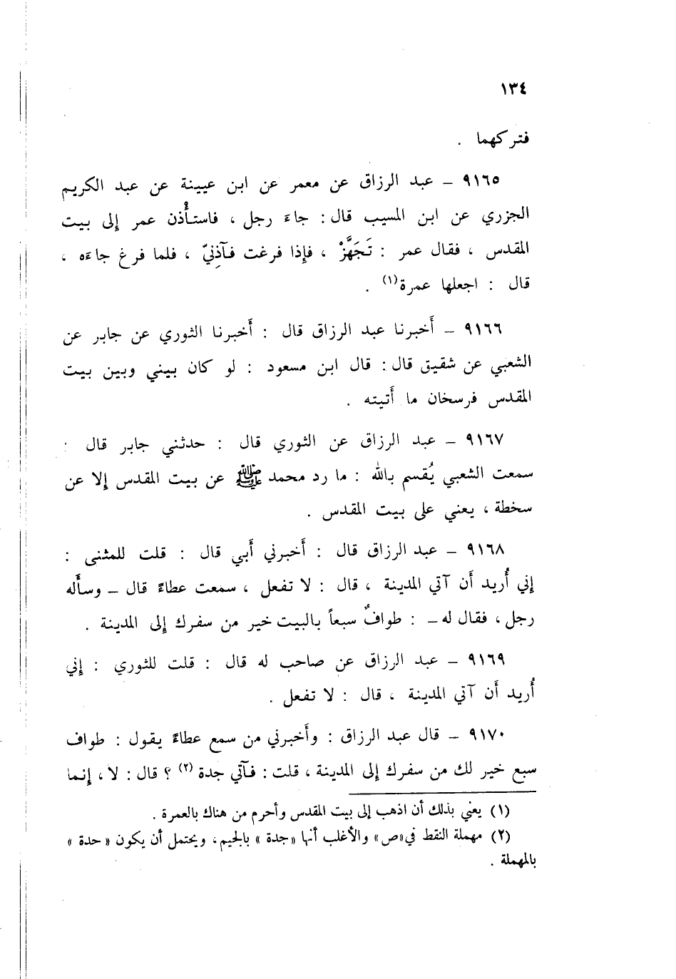 ٩١٦٦ - عَبْدُ الرَّزَّاقِ قَالَ: أَخْبَرَنَا الثَّوْرِيُّ، عَنْ جَابِرٍ، عَنِ الشَّعْبِيِّ، عَنْ شَقِيقٍ قَالَ: قَالَ ابْنُ مَسْعُودٍ: «لَوْ كَانَ بَيْنِي وَبَيْنَ بَيْتِ الْمَقْدِسِ فَرْسَخَانِ مَا أَتَيْتُهُ»