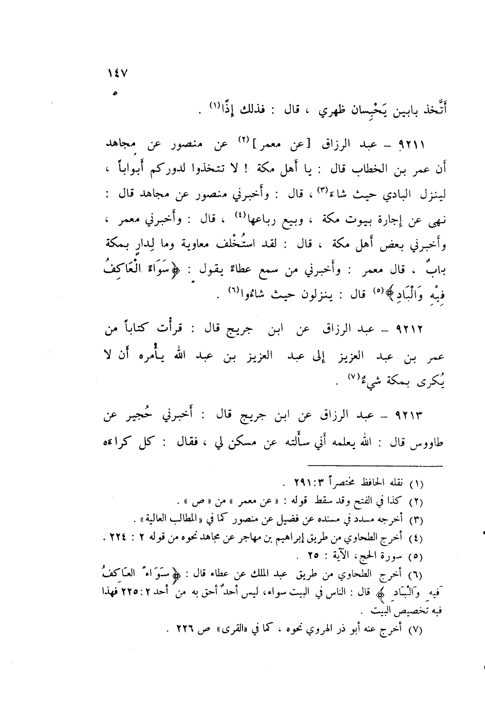 ٩٢١٢ - عَنِ ابْنِ جُرَيْجٍ قَالَ: قَرَأْتُ كِتَابًا مِنْ عُمَرَ بْنِ عَبْدِ الْعَزِيزِ إِلَى عَبْدِ الْعَزِيزِ بْنِ عَبْدِ اللَّهِ: «يَأْمُرُهُ أَنْ لَا يُكْرَى بِمَكَّةَ شَيْءٌ»