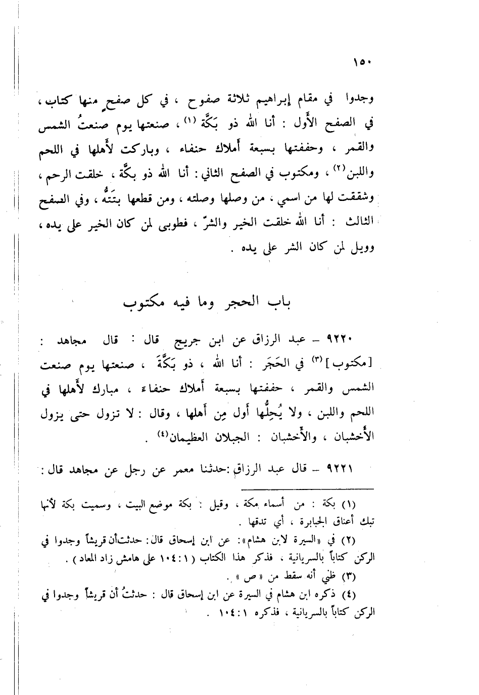 ٩٢٢٠ - عَنِ ابْنِ جُرَيْجٍ قَالَ: قَالَ مُجَاهِدٌ: " مَكْتُوبٌ فِي الْحَجَرِ: أَنَا اللَّهُ ذُو بَكَّةَ صَنَعْتُهَا يَوْمَ صَنَعْتُ الشَّمْسَ وَالْقَمَرَ، حَفَفْتُهَا بِسَبْعَةِ أَمْلَاكٍ حُنَفَاءَ، مُبَارَكٌ لِأَهْلِهَا فِي اللَّحْمِ وَاللَّبَنِ، وَلَا يُحِلُّهَا أَوَّلُ مَنْ أَهَلَّهَا، وَقَالَ: لَا تَزُولُ حَتَّى يَزُولَ الْأَخْشَبَانِ وَالْأَخْشَبَانِ: الْجَبَلَانِ الْعَظِيمَانِ "