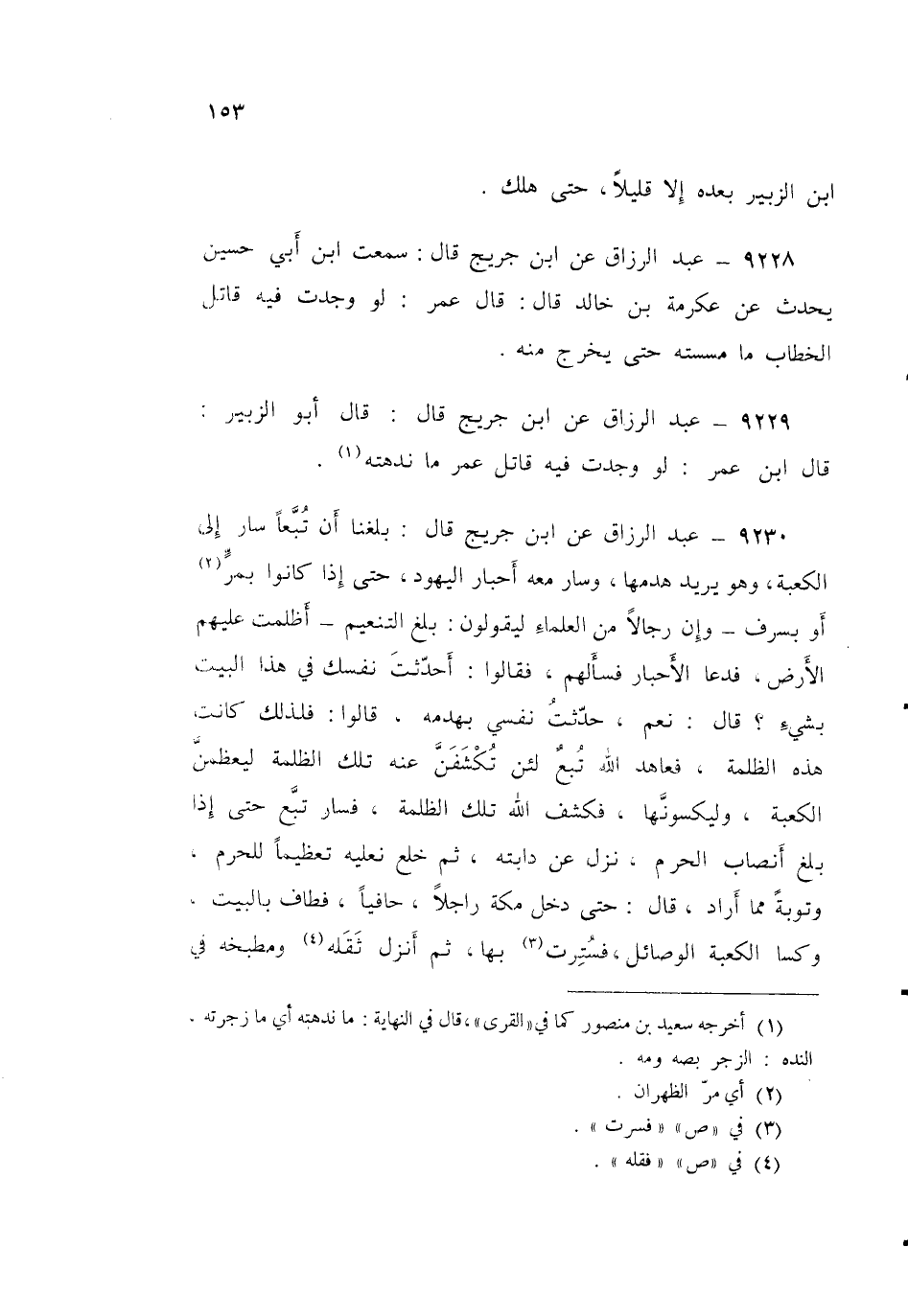 ٩٢٢٩ - عَنِ ابْنِ جُرَيْجٍ قَالَ: قَالَ أَبُو الزُّبَيْرِ: قَالَ ابْنُ عُمَرَ: «لَوْ وَجَدْتُ فِيهِ قَاتِلَ عُمَرَ مَا نَدَهْتُهُ»