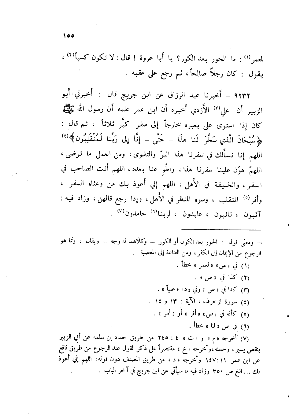 ٩٢٣٢ - أَخْبَرَنَا عَبْدُ الرَّزَّاقِ، عَنِ ابْنِ جُرَيْجٍ قَالَ: أَخْبَرَنِي أَبُو الزُّبَيْرِ: أَنَّ عَلِيًّا الْأَزْدِيَّ، أَخْبَرَهُ أَنَّ ابْنَ عُمَرَ عَلَّمَهُ أَنَّ رَسُولَ اللَّهِ صَلَّى اللهُ عَلَيْهِ وَسَلَّمَ كَانَ إِذَا اسْتَوَى عَلَى بَعِيرِهِ خَارِجًا إِلَى سَفَرٍ كَبَّرَ ثَلَاثًا، ثُمَّ قَالَ: " {سُبْحَانَ الَّذِي سَخَّرَ لَنَا هَذَا} [الزخرف: ١٣]، حَتَّى {إِنَّا إِلَى رَبِّنَا لَمُنْقَلِبُونَ} [الزخرف: ١٤] اللَّهُمَّ إِنَّا نَسْأَلُكَ فِي سَفَرِنَا هَذَا الْبِرَّ وَالتَّقْوَى وَمِنَ الْعَمَلِ مَا تَرْضَى، اللَّهُمَّ هَوِّنْ عَلَيْنَا سَفَرَنَا هَذَا، وَاطْوِ عَنَّا بُعْدَهُ، اللَّهُمَّ أَنْتَ الصَّاحِبُ فِي السَّفَرِ، وَالْخَلِيفَةُ فِي الْأَهْلِ اللَّهُمَّ إِنِّي أَعُوذُ بِكَ مِنْ وَعْثَاءِ السَّفَرِ، وَأَمْرِ الْمُنْقَلَبِ وَسُوءِ الْمَنْظَرِ فِي الْأَهْلِ "، وَإِذَا رَجَعَ قَالَهُنَّ، وَزَادَ فِيهِ: «آئِبُونَ، تَائِبُونَ، عَابِدُونَ، لِرَبِّنَا حَامِدُونَ»