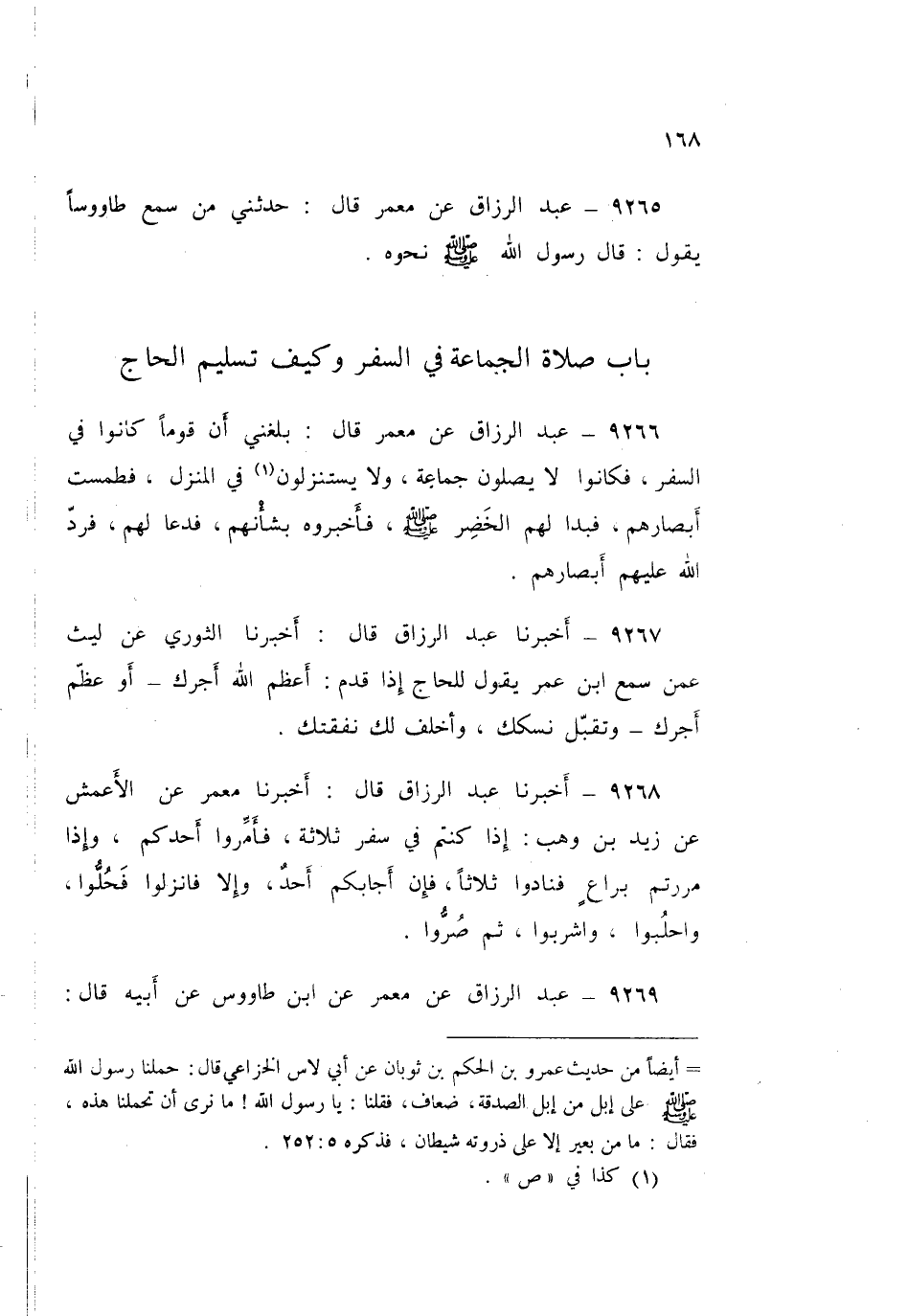 ٩٢٦٦ - عَنْ مَعْمَرٍ قَالَ: «بَلَغَنِي أَنَّ قَوْمًا كَانُوا فِي السَّفَرِ، فَكَانُوا لَا يُصَلُّونَ جَمَاعَةً، وَلَا يَسْتَنْزِلُونَ فِي الْمَنْزِلِ، فَطُمِسَتْ أَبْصَارُهُمْ فَبَدَا لَهُمُ الْخَضِرُ صَلَّى اللهُ عَلَيْهِ وَسَلَّمَ، فَأَخْبَرُوهُ بِشَأْنِهِمْ، فَدَعَا لَهُمْ فَرَدَّ اللَّهُ عَلَيْهِمْ أَبْصَارَهُمْ»