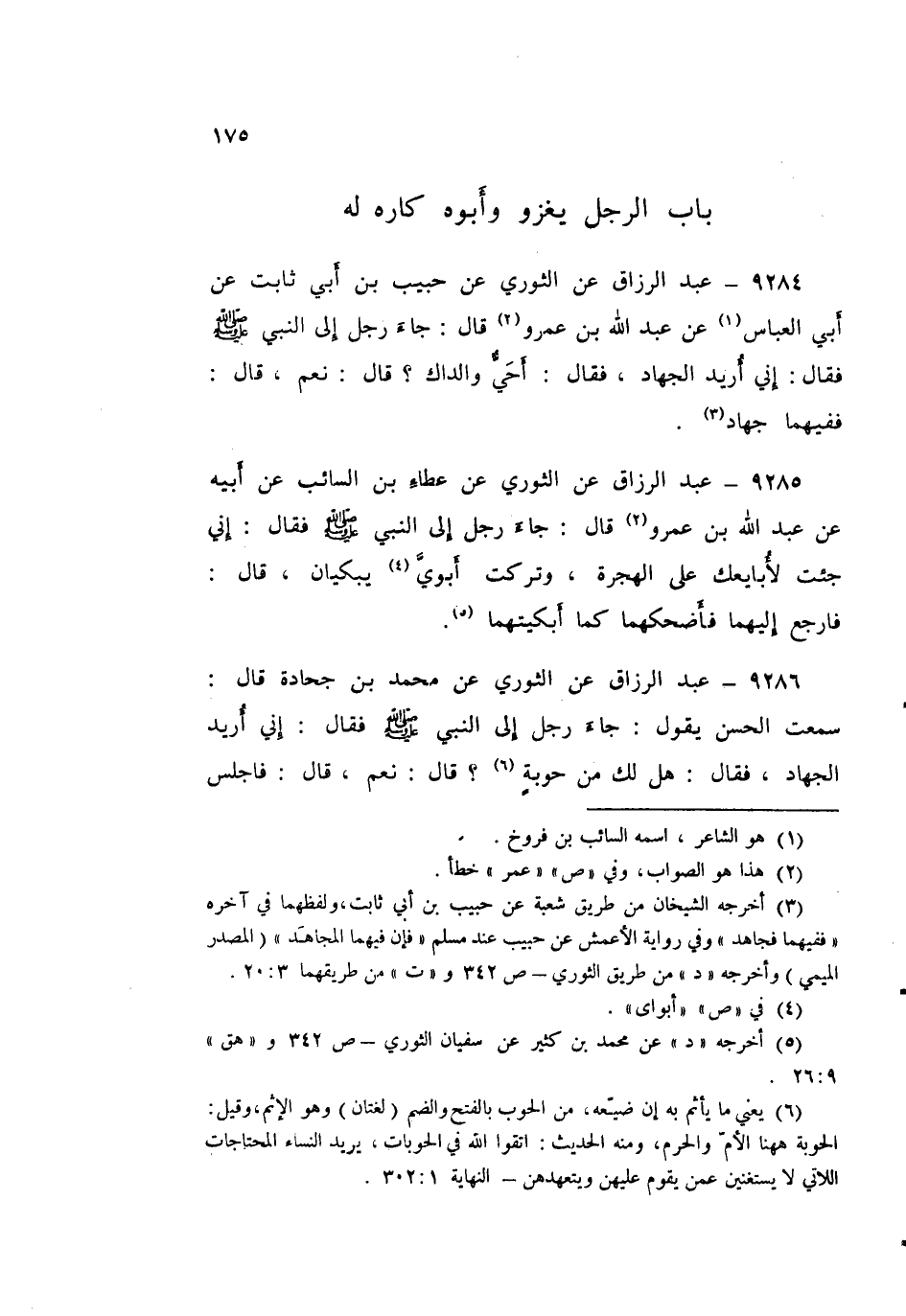 ٩٢٨٤ - عَنِ الثَّوْرِيِّ، عَنْ حَبِيبِ بْنِ أَبِي ثَابِتٍ، عَنْ أَبِي الْعَبَّاسِ، عَنْ عَبْدِ اللَّهِ بْنِ عَمْرٍو قَالَ: جَاءَ رَجُلٌ إِلَى النَّبِيِّ صَلَّى اللهُ عَلَيْهِ وَسَلَّمَ، فَقَالَ: إِنِّي أُرِيدُ الْجِهَادَ فَقَالَ: «أَحَيٌّ وَالِدَاكَ؟» قَالَ: نَعَمْ قَالَ: «فَفِيهِمَا جِهَادٌ»