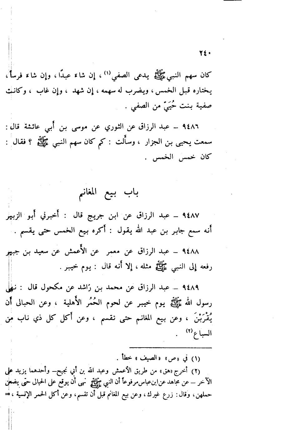 ٩٤٨٩ - عَنْ مُحَمَّدِ بْنِ رَاشِدٍ، عَنْ مَكْحُولٍ قَالَ: «نَهَى رَسُولُ اللَّهِ صَلَّى اللهُ عَلَيْهِ وَسَلَّمَ يَوْمَ خَيْبَرَ عَنْ لُحُومِ الْحُمُرِ الْأَهْلِيَّةِ، وَعَنِ الْحَبَالَى أَنْ يُقْرَبْنَ، وَعَنْ بَيْعِ الْمَغَانِمِ حَتَّى تُقْسَمَ، وَعَنْ أَكْلِ كُلِّ ذِي نَابٍ مِنَ السِّبَاعِ»، عَبْدُ الرَّزَّاقِ،