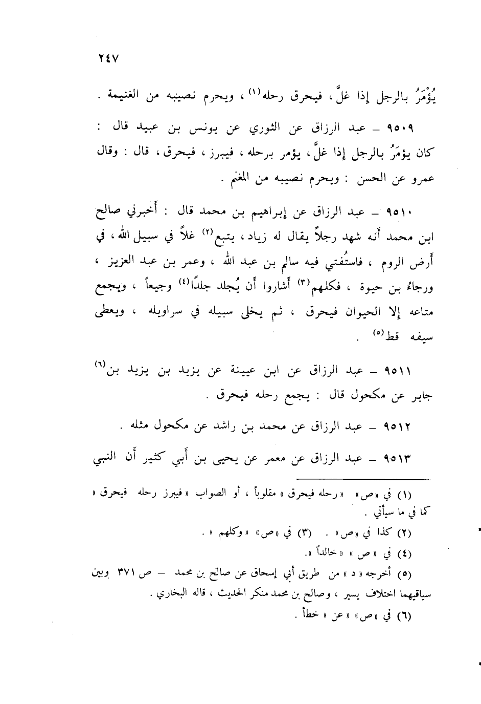 ٩٥١٠ - عَنْ إِبْرَاهِيمَ بْنِ مُحَمَّدٍ قَالَ: أَخْبَرَنِي صَالِحُ بْنُ مُحَمَّدٍ أَنَّهُ شَهِدَ رَجُلًا يُقَالُ لَهُ زِيَادٌ يَتْبَعُ غَلًا فِي سَبِيلِ اللَّهِ فِي أَرْضِ الرُّومِ، فَاسْتُفْتِيَ فِيهِ سَالِمُ بْنُ عَبْدِ اللَّهِ وَعُمَرُ بْنُ عَبْدِ الْعَزِيزِ، وَرَجَاءُ بْنُ حَيْوَةَ، فَكُلُّهُمْ أَشَارُوا: «أَنْ يُجْلَدَ جَلْدًا وَجِيعًا، وَيُجْمَعُ مَتَاعُهُ إِلَّا الْحَيوَانَ فَيُحَرَّقُ، ثُمَّ يُخَلَّى سَبِيلُهُ فِي سَرَاوِيلِهِ، وَيُعْطَى سَيْفُهُ قَطُّ» عَبْدُ الرَّزَّاقِ،