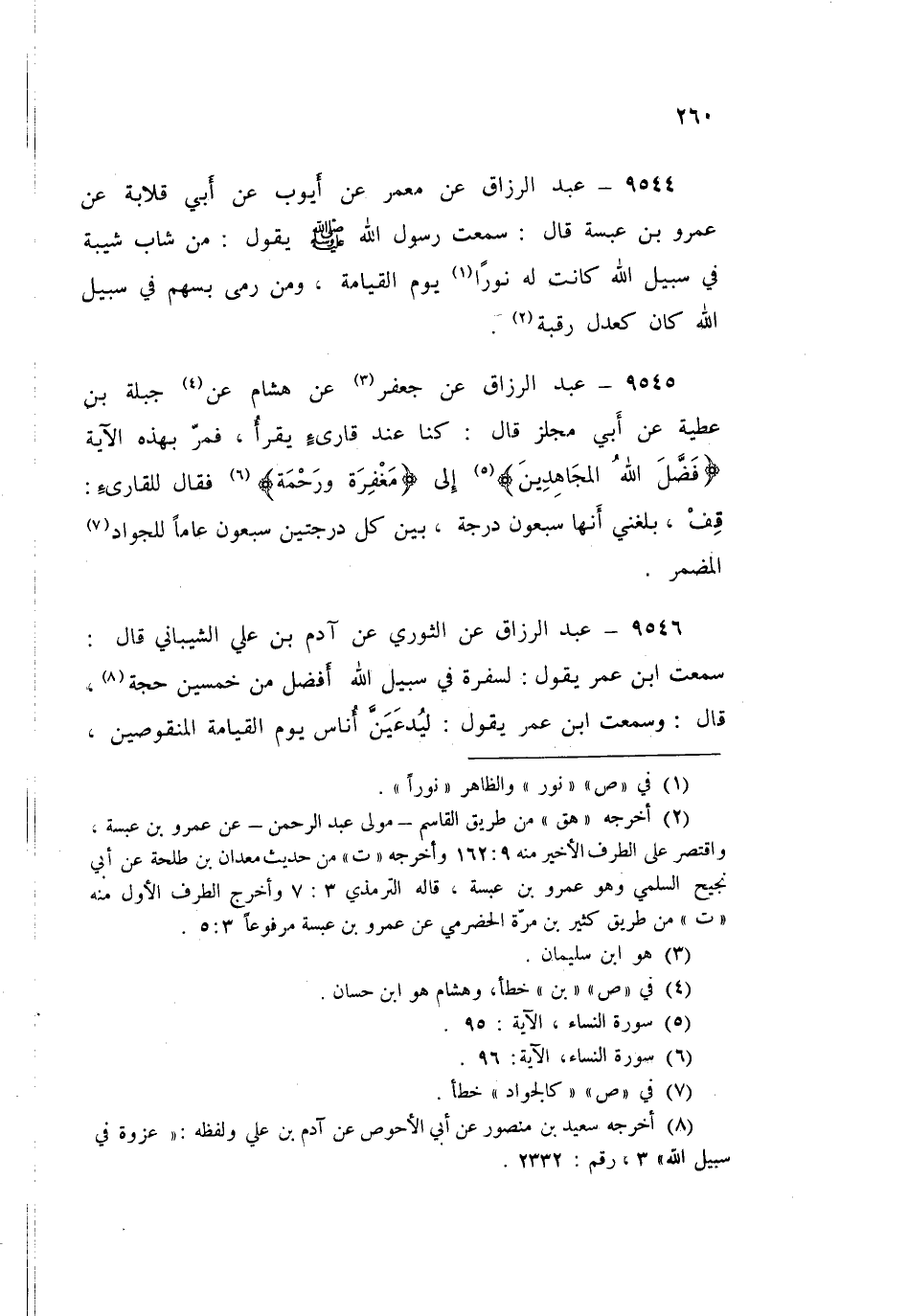 ٩٥٤٥ - عَنْ جَعْفَرٍ، عَنْ هِشَامٍ، عَنْ جَبَلَةَ بْنِ عَطِيَّةَ، عَنْ أَبِي مِجْلَزٍ قَالَ: " كُنَّا عِنْدَ قَارئٍ يَقْرَأُ، فَمَرَّ بِهَذِهِ الْآيَةِ: {فَضَّلَ اللَّهُ الْمُجَاهِدِينَ} [النساء: ٩٥] إِلَى {مَغْفِرَةً وَرَحْمَةً} [النساء: ٩٦] " فَقَالَ لِلْقَارئِ: «قِفْ بَلَغَنِي أَنَّهُا سَبْعُونَ دَرَجَةً بَيْنَ كُلِّ دَرَجَتَيْنِ سَبْعُونَ عَامًا لِلْجَوَادِ الْمُضَمَّرِ»