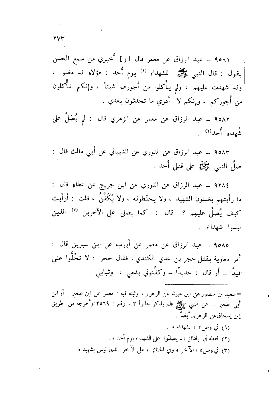 ٩٥٨٢ - عَنْ مَعْمَرٍ، عَنِ الزُّهْرِيِّ قَالَ: «لَمْ يُصَلَّ عَلَى شُهَدَاءِ أُحُدٍ»