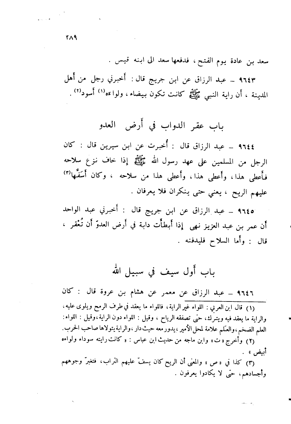 ٩٦٤٤ - قَالَ: أُخْبِرْتُ، عَنِ ابْنِ سِيرِينَ قَالَ: «كَانَ الرَّجُلُ مِنَ الْمُسْلِمِينَ عَلَى عَهْدِ رَسُولِ اللَّهِ صَلَّى اللهُ عَلَيْهِ وَسَلَّمَ إِذَا خَافَ نَزَعَ سِلَاحَهُ، فَأَعْطَى هَذَا، وَأَعْطَى هَذَا، وَأَعْطَى هَذَا مِنْ سِلَاحِهِ، وَكَانَ أَسَفَّهَا عَلَيْهِمُ الرِّيحَ يَعْنِي حَتَّى يُنْكَرَانِ فَلَا يُعْرَفَانِ»