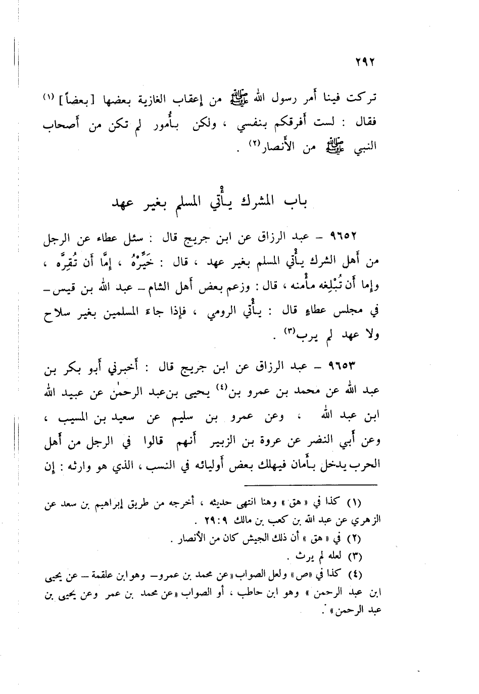 ٩٦٥٢ - عَنِ ابْنِ جُرَيْجٍ قَالَ: سُئِلَ عَطَاءٌ عَنِ الرَّجُلِ مِنْ أَهْلِ الشِّرْكِ يَأْتِي الْمُسْلِمَ بِغَيْرِ عَهْدٍ قَالَ: «خَيِّرْهُ إِمَّا أَنْ تُقِرَّهُ، وَإِمَّا أَنْ تُبْلِغَهُ مَأْمَنَهُ» قَالَ: وَزَعَمَ بَعْضُ أَهْلِ الشَّامِ عَبْدُ اللَّهِ بْنُ قَيْسٍ فِي مَجْلِسِ عَطَاءٍ قَالَ: يَأْتِي الرُّومِيُّ فَإِذَا جَاءَ الْمُسْلِمِينَ بِغَيْرِ سِلَاحٍ وَلَا عَهْدٍ لَمْ يُرَبْ