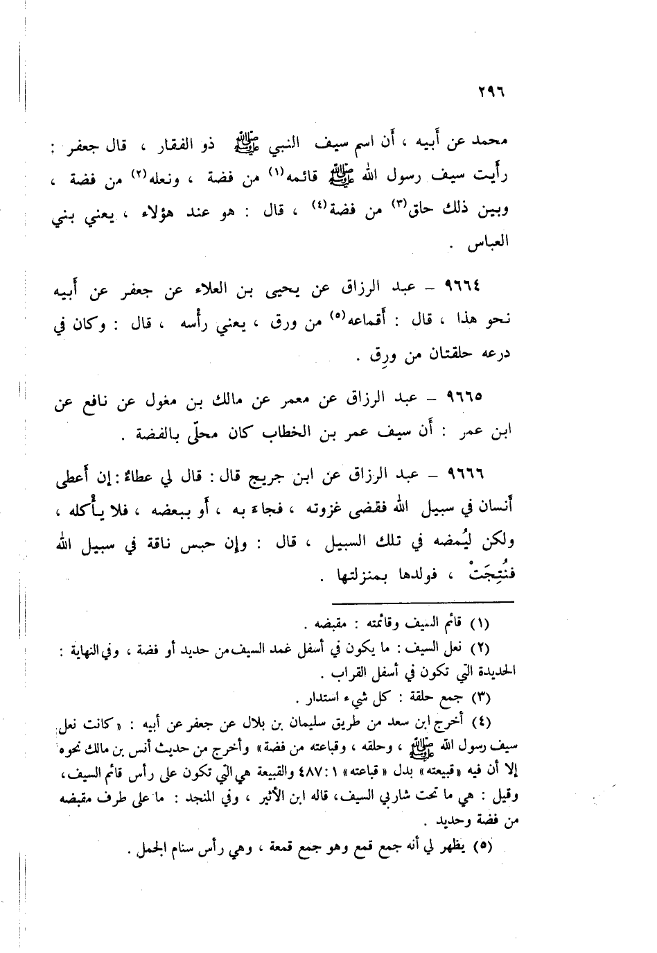 ٩٦٦٥ - عَنْ مَعْمَرٍ عَنْ مَالِكِ بْنِ مِغْوَلٍ، عَنْ نَافِعٍ، عَنِ ابْنِ عُمَرَ: «أَنَّ سَيْفَ عُمَرِ بْنِ الْخَطَّابِ كَانَ مُحَلَّى بِالْفِضَّةِ»