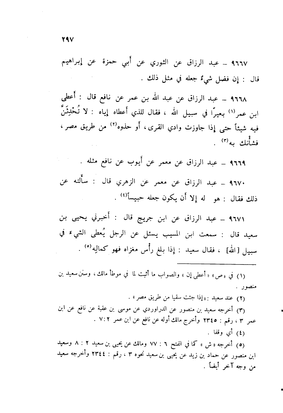 ٩٦٦٨ - عَنْ عَبْدِ اللَّهِ بْنِ عُمَرَ، عَنْ نَافِعٍ قَالَ: أَعْطَى ابْنُ عُمَرَ بَعِيرًا فِي سَبِيلِ اللَّهِ، فَقَالَ لِلَّذِي أَعْطَاهُ إِيَّاهُ: «لَا تُحْدِثَنَّ فِيهِ شَيْئًا حَتَّى إِذَا جَاوَزْتَ وَادِي الْقُرَى أَوْ حَذْوَهُ مِنْ طَرِيقِ مِصْرَ فَشَأْنُكَ بِهِ»، عَبْدُ الرَّزَّاقِ،