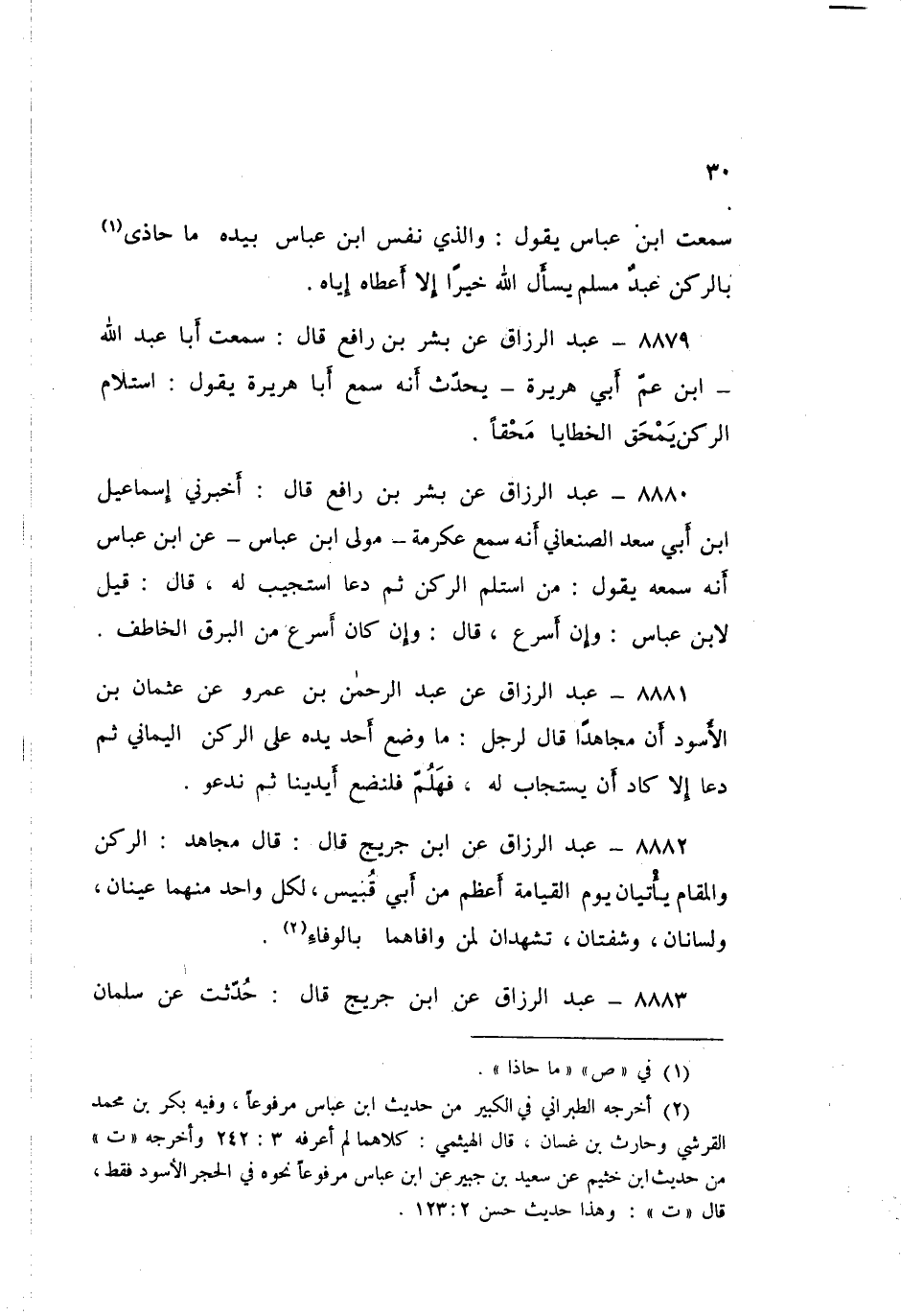 ٨٨٨٠ - عَنْ بِشْرِ بْنِ رَافِعٍ قَالَ: أَخْبَرَنِي إِسْمَاعِيلُ بْنُ أَبِي سَعْدٍ الصَّنْعَانِيُّ، أَنَّهُ سَمِعَ عِكْرِمَةَ، مَوْلَى ابْنِ عَبَّاسٍ، عَنِ ابْنِ عَبَّاسٍ، أَنَّهُ سَمِعَهُ يَقُولُ: «مَنِ اسْتَلَمَ الرُّكْنَ، ثُمَّ دَعَا اسْتُجِيبَ لَهُ» قَالَ: قِيلَ لِابْنِ عَبَّاسٍ: وَإِنْ أَسْرَعَ قَالَ: «وَإِنْ كَانَ أَسْرَعَ مِنَ الْبَرْقِ الْخَاطِفِ»