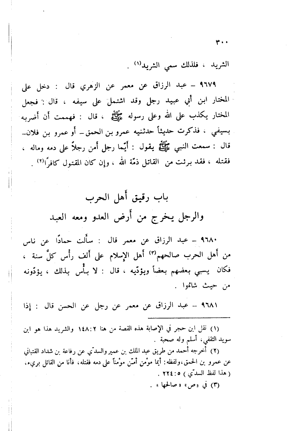 ٩٦٧٩ - عَنْ مَعْمَرٍ، عَنِ الزُّهْرِيِّ قَالَ: دَخَلَ عَلَى الْمُخْتَارِ بْنِ أَبِي عُبَيْدٍ رَجُلٌ وَقَدِ اشْتَمَلَ عَلَى سَيْفِهِ قَالَ: فَجَعَلَ الْمُخْتَارُ يَكْذِبُ عَلَى اللَّهِ وَعَلَى رَسُولِهِ صَلَّى اللهُ عَلَيْهِ وَسَلَّمَ قَالَ: فَهَمَمْتُ أَنْ أَضْرِبَهُ بِسَيْفِي، فَذَكَرْتُ حَدِيثًا حَدَّثَنِيهِ عَمْرُو بْنُ الْحَمِقِ أَوْ عَمْرُو بْنُ فُلَانٍ قَالَ: سَمِعْتُ النَّبِيَّ صَلَّى اللهُ عَلَيْهِ وَسَلَّمَ يَقُولُ: «أَيُّمَا رَجُلٌ أَمَّنَ رَجُلًا عَلَى دَمِهِ وَمَالِهِ فَقَتَلَهُ فَقَدْ بَرِئَتْ مِنَ الْقَاتِلِ ذِمَّةُ اللَّهِ، وَإِنْ كَانَ الْمَقْتُولُ كَافِرًا»