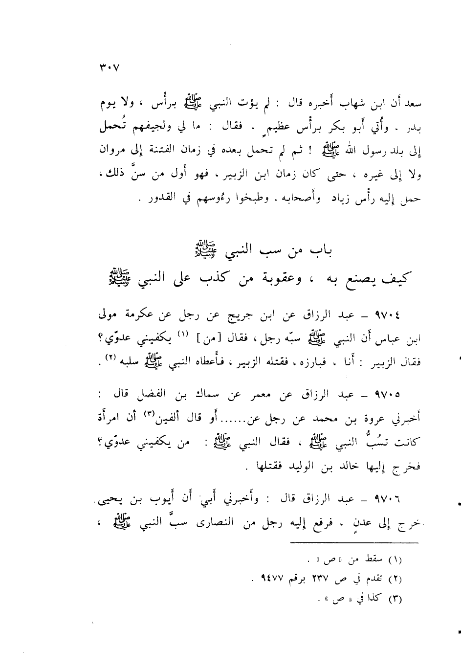 ٩٧٠٦ - عَبْدُ الرَّزَّاقِ، وَأَخْبَرَنِي أَبِي: أَنَّ أَيُّوبَ بْنَ يَحْيَى خَرَجَ إِلَى عَدَنٍ فَرَفَعَ إِلَيْهِ رَجُلٌ مِنَ النَّصَارَى سَبَّ النَّبِيَّ صَلَّى اللهُ عَلَيْهِ وَسَلَّمَ فَاسْتَشَارَ فِيهِ فَأَشَارَ عَلَيْهِ عَبْدُ الرَّحْمَنِ بْنُ يَزِيدَ الصَّنَعَانِيُّ أَنْ يَقْتُلَهُ "، فَقَتَلَهُ، وَرَوَى لَهُ فِي ذَلِكَ حَدِيثًا قَالَ: وَكَانَ قَدْ لَقِيَ عُمَرَ وَسَمِعَ مِنْهُ عِلْمًا كَثِيرًا قَالَ: فَكَتَبَ فِي ذَلِكَ أَيُّوبُ إِلَى عَبْدِ الْمَلِكِ، أَوْ إِلَى الْوَلِيدِ بْنِ عَبْدِ الْمَلِكِ، فَكَتَبَ يُحَسِّنُ ذَلِكَ