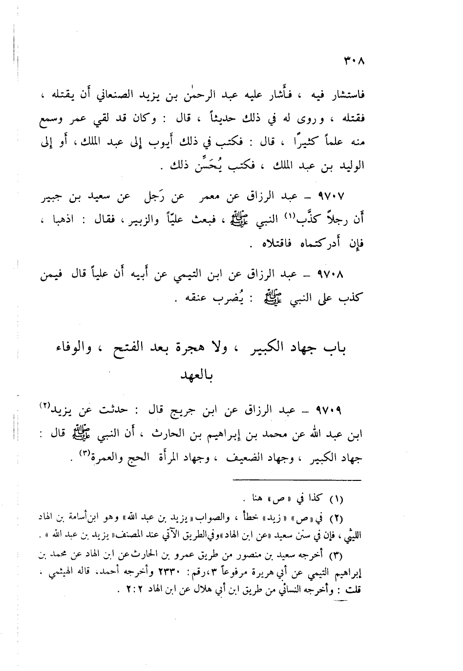 ٩٧٠٩ - عَنِ ابْنِ جُرَيْجٍ قَالَ: حُدِّثْتُ عَنْ يَزِيدَ بْنِ عَبْدِ اللَّهِ، عَنْ مُحَمَّدِ بْنِ إِبْرَاهِيمَ بْنِ الْحَارِثِ، أَنَّ النَّبِيَّ صَلَّى اللهُ عَلَيْهِ وَسَلَّمَ قَالَ: «جِهَادُ الْكَبِيرِ، وَجِهَادُ الضَّعِيفِ، وَجِهَادُ الْمَرْأَةِ الْحَجُّ وَالْعُمْرَةُ»، عَبْدُ الرَّزَّاقِ،
