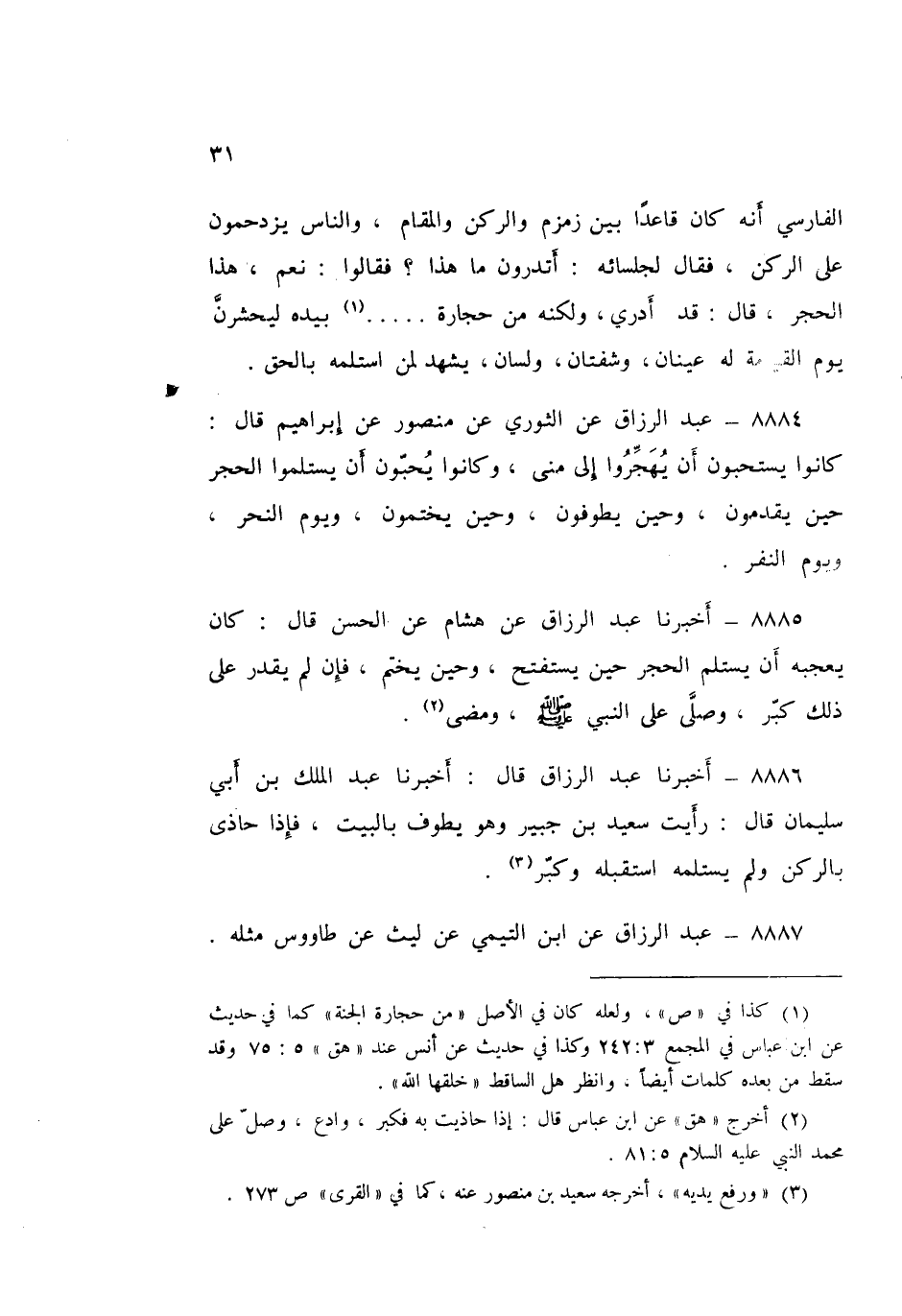 ٨٨٨٦ - عَبْدُ الرَّزَّاقِ قَالَ: أَخْبَرَنَا عَبْدُ الْمَلِكِ بْنُ أَبِي سُلَيْمَانَ قَالَ: رَأَيْتُ سَعِيدَ بْنَ جُبَيْرٍ وَهُوَ يَطُوفُ بِالْبَيْتِ، فَإِذَا حَاذَى بِالرُّكْنِ وَلَمْ يَسْتَلِمَهُ اسْتَقْبَلَهُ وَكَبَّرَ "، عَبْدُ الرَّزَّاقِ،
