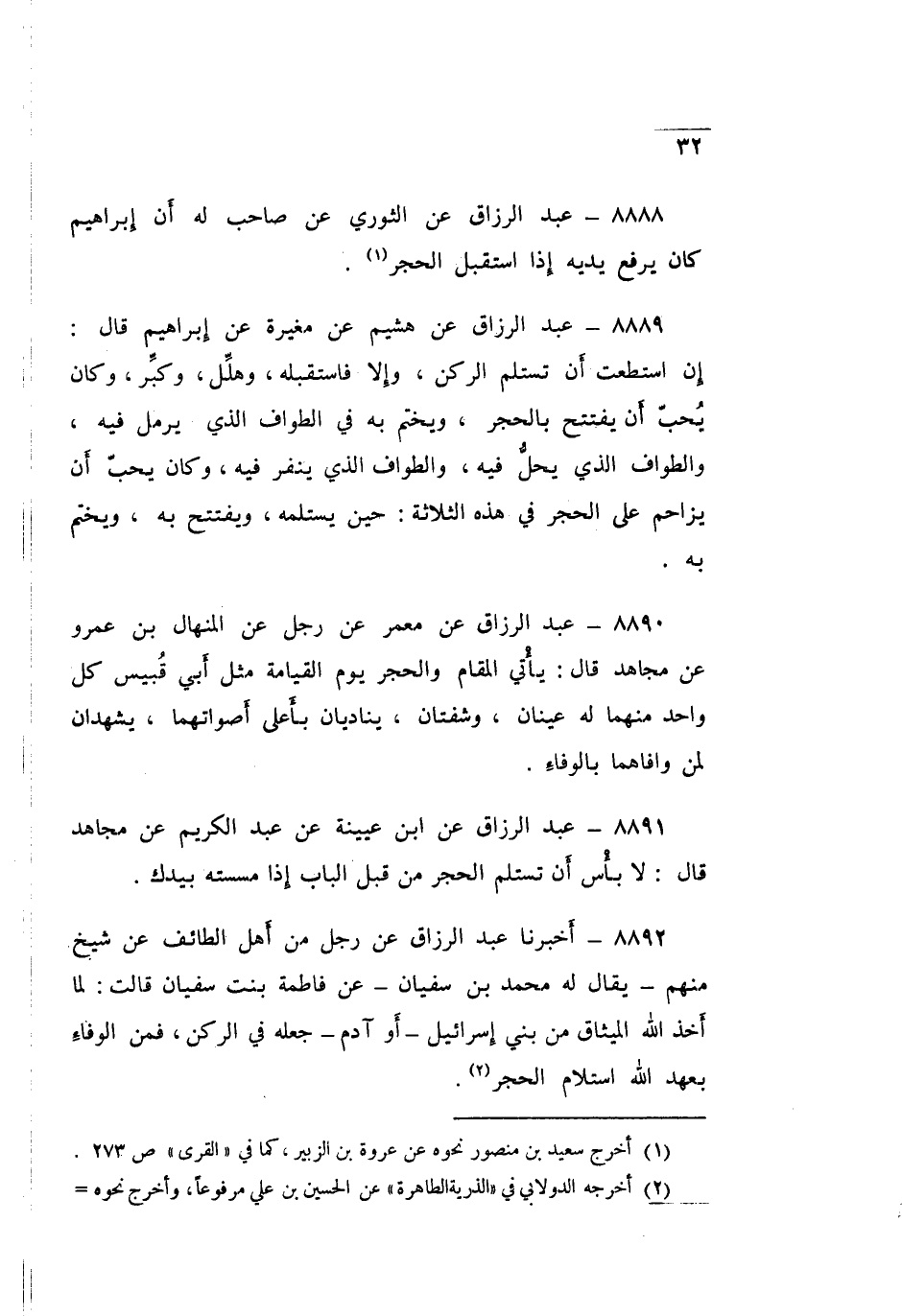 ٨٨٩٢ - أَخْبَرَنَا عَبْدُ الرَّزَّاقِ، عَنْ رَجُلٍ، مِنْ أَهْلِ الطَّائِفِ، عَنْ شَيْخٍ مِنْهُمْ يُقَالُ لَهُ مُحَمَّدُ بْنُ سُفْيَانَ، عَنْ فَاطِمَةَ بِنْتِ سُفْيَانَ قَالَتْ: «لَمَّا أَخَذَ اللَّهُ الْمِيثَاقَ مِنْ بَنِي إِسْرَائِيلَ ـ أَوْ آدَمَ ـ جَعَلَهُ فِي الرُّكْنِ، فَمِنَ الْوَفَاءِ بِعَهْدِ اللَّهِ اسْتِلَامُ الْحَجَرِ»