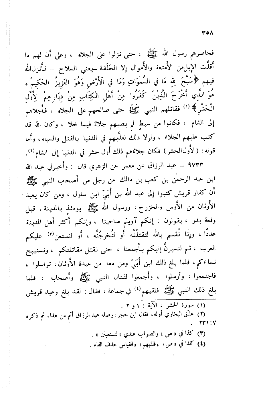 ٩٧٣٣ - عَنْ مَعْمَرٍ، عَنِ الزُّهْرِيِّ قَالَ: وَأَخْبَرَنِي عَبْدُ اللَّهِ بْنُ عَبْدِ الرَّحْمَنِ بْنِ كَعْبِ بْنِ مَالِكٍ، عَنْ رَجُلٍ مِنْ أَصْحَابِ النَّبِيِّ صَلَّى اللهُ عَلَيْهِ وَسَلَّمَ: " أَنَّ كُفَّارَ قُرَيْشٍ كَتَبُوا إِلَى عَبْدِ اللَّهِ بْنِ أُبَيٍّ ابْنِ السَّلُولِ، وَمَنْ كَانَ يَعْبُدُ الْأَوْثَانَ مِنَ الْأَوْسِ وَالْخَزْرَجِ، وَرَسُولُ اللَّهِ صَلَّى اللهُ عَلَيْهِ وَسَلَّمَ يَوْمَئِذٍ بِالْمَدِينَةِ، قَبْلَ وَقْعَةِ بَدْرٍ يَقُولُونَ: إِنَّكُمْ آوَيْتُمْ صَاحِبَنَا، وَإِنَّكُمْ أَكْثَرُ أَهْلِ الْمَدِينَةِ عَدَدًا، وَإِنَّا نُقْسِمُ بِاللَّهِ لَتَقْتُلُنَّهُ، أَوْ لَتُخْرِجُنَّهُ، أَوْ لِنَسْتَعِنْ عَلَيْكُمُ الْعَرَبَ، ثُمَّ لَنَسِيرَنَّ إِلَيْكُمْ بِأَجْمَعِنَا حَتَّى نَقْتُلَ مُقَاتِلَتَكُمْ، وَنَسْتَبِيحَ نِسَاءَكُمْ، فَلَمَّا بَلَغَ ذَلِكَ ابْنَ أُبَيٍّ وَمَنْ مَعَهُ مِنْ عَبْدَةِ الْأَوْثَانِ تَرَاسَلُوا فَاجْتَمَعُوا، وَأَرْسَلُوا، وَأَجْمَعُوا لِقِتَالِ النَّبِيِّ صَلَّى اللهُ عَلَيْهِ وَسَلَّمَ وَأَصْحَابِهِ، فَلَمَّا بَلَغَ ذَلِكَ النَّبِيَّ صَلَّى اللهُ عَلَيْهِ وَسَلَّمَ، فَلَقِيَهُمْ فِي جَمَاعَةٍ فَقَالَ: «لَقَدْ بَلَغَ وَعِيدُ قُرَيْشٍ ⦗٣٥٩⦘ مِنْكُمُ الْمَبَالِغَ، مَا كَانَتْ لِتَكِيدَكُمْ بِأَكْثَرَ مِمَّا تُرِيدُونَ أَنْ تَكِيدُوا بِهِ أَنْفُسَكُمْ، فَأَنْتُمْ هَؤُلَاءِ تُرِيدُونَ أَنْ تَقْتُلُوا أَبْنَاءَكُمْ وَإِخْوَانَكُمْ» فَلَمَّا سَمِعُوا ذَلِكَ مِنَ النَّبِيِّ صَلَّى اللهُ عَلَيْهِ وَسَلَّمَ تَفَرَّقُوا، فَبَلَغَ ذَلِكَ كُفَّارَ قُرَيْشٍ، وَكَانَتْ وَقْعَةُ بَدْرٍ فَكَتَبَتْ كُفَّارُ قُرَيْشٍ بَعْدَ وَقْعَةِ بَدْرٍ إِلَى الْيَهُودِ: إِنَّكُمْ أَهْلُ الْحَلْقَةِ وَالْحُصُونِ، وَإِنَّكُمْ لَتُقَاتِلُنَّ صَاحِبَنَا، أَوْ لَنَفْعَلَنَّ كَذَا وَكَذَا، وَلَا يَحُولُ بَيْنَنَا وَبَيْنَ خَدَمِ نِسَائِكُمْ شَيْءٌ، ـ وَهُوَ الْخَلَاخِلُ ـ فَلَمَّا بَلَغَ كِتَابُهُمُ الْيَهُودَ أَجْمَعَتْ بَنُو النَّضِيرِ عَلَى الْغَدْرِ، فَأَرْسَلَتْ إِلَى النَّبِيِّ صَلَّى اللهُ عَلَيْهِ وَسَلَّمَ اخْرُجْ إِلَيْنَا فِي ثَلَاثِينَ رَجُلًا مِنْ أَصْحَابِكَ، وَلْنَخْرُجْ فِي ثَلَاثِينَ حَبْرًا حَتَّى نَلْتَقِي فِي مَكَانِ كَذَا نَصْفٌ بَيْنَنَا وَبَيْنَكُمْ، فَيَسْمَعُوا مِنْكَ، فَإِنْ صَدَّقُوكَ وَآمَنُو بِكَ، آمَنَّا كُلُّنَا، فَخَرَجَ النَّبِيُّ صَلَّى اللهُ عَلَيْهِ وَسَلَّمَ فِي ثَلَاثِينَ مِنْ أَصْحَابِهِ، وَخَرَجَ إِلَيْهِ ثَلَاثُونَ حَبْرًا مِنَ الْيَهُودِ حَتَّى إِذَا بَرَزُوا فِي بِرَازٍ مِنَ الْأَرْضِ، قَالَ بَعْضُ الْيَهُودِ لِبَعْضٍ: كَيْفَ تَخْلُصُونَ إِلَيْهِ، وَمَعَهُ ثَلَاثُونَ رَجُلًا مِنْ أَصْحَابِهْ كُلُّهُمْ يُحِبُّ أَنْ يَمُوتَ قَبْلَهُ، فَأَرْسَلُوا إِلَيْهِ: كَيْفَ تَفْهَمُ وَنَفْهَمُ وَنَحْنُ سِتُّونَ رَجُلًا؟ اخْرُجْ فِي ثَلَاثَةٍ مِنْ أَصْحَابِكَ، وَيَخْرُجُ إِلَيْكَ ثَلَاثَةٌ مِنْ عُلَمَائِنَا، فَلْيَسْمَعُوا مِنْكَ، فَإِنْ آمَنُوا بِكَ آمَنَّا كُلُّنَا، وَصَدَّقْنَاكَ فَخَرَجَ النَّبِيُّ صَلَّى اللهُ عَلَيْهِ وَسَلَّمَ فِي ثَلَاثَةِ نَفَرٍ مِنْ أَصْحَابِهِ، وَاشْتَمَلُوا عَلَى الْخَنَاجِرِ، وَأَرَادُوا الْفَتْكَ بِرَسُولِ اللَّهِ صَلَّى اللهُ عَلَيْهِ وَسَلَّمَ، فَأَرْسَلَتِ امْرَأَةٌ نَاصِحَةٌ مِنْ بَنِي النَّضِيرِ إِلَى بَنِي أَخِيهَا، وَهُوَ رَجُلٌ مُسْلِمٌ مِنَ الْأَنْصَارِ فَأَخْبَرَتْهُ خَبَرَ مَا أَرَادَتْ بَنُو النَّضِيرِ مِنَ الْغَدْرِ بِرَسُولِ اللَّهِ صَلَّى اللهُ عَلَيْهِ وَسَلَّمَ، فَأَقْبَلَ أَخُوهَا سَرِيعًا، حَتَّى أَدْرَكَ النَّبِيَّ صَلَّى اللهُ عَلَيْهِ وَسَلَ