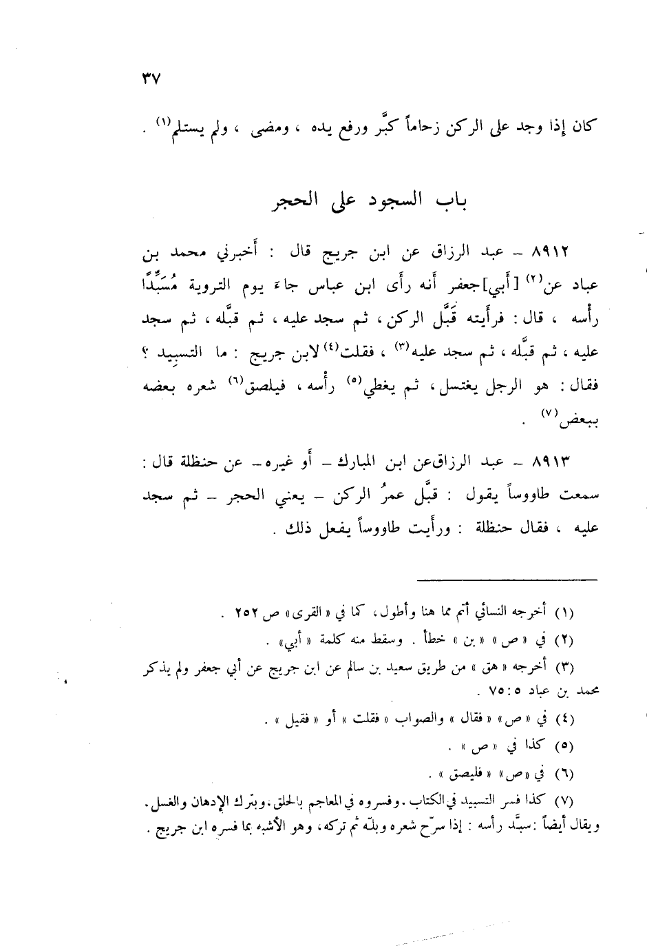 ٨٩١٢ - عَنِ ابْنِ جُرَيْجٍ قَالَ: أَخْبَرَنِي مُحَمَّدُ بْنُ عَبَّادٍ، عَنْ أَبِي جَعْفَرٍ: أَنَّهُ رَأَى ابْنَ عَبَّاسٍ جَاءَ يَوْمَ التَّرْوِيَةِ مُسَبِّدًا رَأْسَهُ قَالَ: «فَرَأَيْتَهُ قَبَّلَ الرُّكْنَ، ثُمَّ سَجَدَ عَلَيْهِ، ثُمَّ قَبَّلَهُ، ثُمَّ سَجَدَ عَلَيْهِ، ثُمَّ قَبَّلَهُ، ثُمَّ سَجَدَ عَلَيْهِ» فَقُلْتُ لِابْنِ جُرَيْجٍ: مَا التَّسْبِيدُ؟ فَقَالَ: «هُوَ الرَّجُلُ يَغْتَسِلُ ثُمَّ يُغَطِّي رَأْسَهُ فَيُلْصِقُ شَعْرَهُ بَعْضَهُ بِبَعْضٍ»