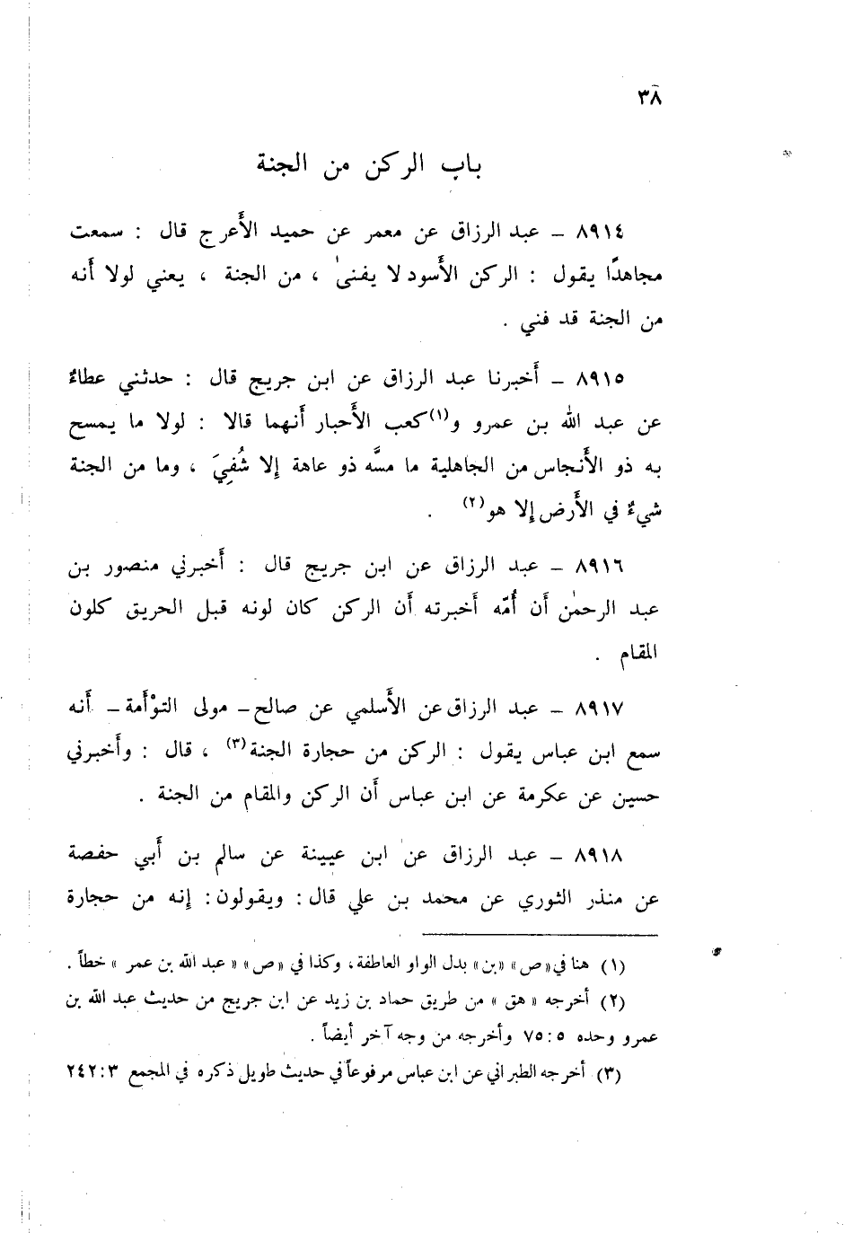 ٨٩١٤ - عَنْ مَعْمَرٍ، عَنْ حُمَيْدٍ الْأَعْرَجِ قَالَ: سَمِعْتُ مُجَاهِدًا يَقُولُ: «الرُّكْنُ الْأَسْوَدُ لَا يَفْنَى مِنَ الْجَنَّةِ، يَعْنِي لَوْلَا أَنَّهُ مِنَ الْجَنَّةِ قَدْ فَنِيَ»