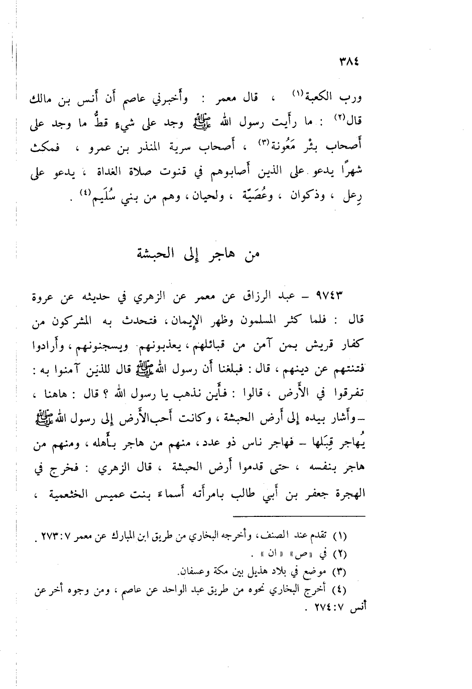 ٩٧٤٣ - عَنْ مَعْمَرٍ، عَنِ الزُّهْرِيِّ فِي حَدِيثِهِ عَنْ عُرْوَةَ قَالَ: فَلَمَّا كَثُرَ الْمُسْلِمُونَ، وَظَهَرَ الْإِيمَانُ فَتَحَدَّثَ بِهِ الْمُشْرِكُونَ مِنْ كُفَّارِ قُرَيْشٍ بِمَنْ آمَنَ مِنْ قَبَائِلِهِمْ يُعَذِّبُونَهُمْ وَيَسْجِنُونَهُمْ، وَأَرَادُوا فِتْنَتَهُمْ عَنْ دِينَهُمْ قَالَ: فَبَلَغَنَا أَنَّ رَسُولَ اللَّهِ صَلَّى اللهُ عَلَيْهِ وَسَلَّمَ قَالَ لِلَّذِينَ آمَنُوا بِهِ: «تَفَرَّقُوا فِي الْأَرْضِ» قَالُوا: فَأَيْنَ نَذْهَبُ يَا رَسُولَ اللَّهِ؟ قَالَ: «هَاهُنَا» وَأَشَارَ بِيَدِهِ إِلَى أَرْضِ الْحَبَشَةِ وَكَانَتْ أَحَبُّ الْأَرْضِ إِلَى رَسُولِ اللَّهِ صَلَّى اللهُ عَلَيْهِ وَسَلَّمَ يُهَاجَرُ قِبَلَهَا فَهَاجَرَ نَاسٌ ذُو عَدَدٍ مِنْهُمْ مَنْ هَاجَرَ بِأَهْلِهِ، وَمِنْهُمْ مَنْ هَاجَرَ بِنَفْسِهِ حَتَّى قَدِمُوا أَرْضَ الْحَبَشَةِ، قَالَ الزُّهْرِيُّ: فَخَرَجَ فِي الْهِجْرَةِ جَعْفَرُ بْنُ أَبِي طَالِبٍ بِامْرَأَتِهِ أَسْمَاءَ بِنْتِ عُمَيْسٍ الْخَثْعَمِيَّةِ ⦗٣٨٥⦘، وَعُثْمَانُ بْنُ عَفَّانَ رَحِمَهُ اللَّهُ بِامْرَأَتِهِ رُقْيَةَ ابْنَةِ رَسُولِ اللَّهِ صَلَّى اللهُ عَلَيْهِ وَسَلَّمَ، وَخَرَجَ فِيهَا خَالِدُ بْنُ سَعِيدِ بْنِ الْعَاصِ بِامْرَأَتِهِ أُمَيْمَةَ ابْنَةِ خَلَفٍ، وَخَرَجَ فِيهَا أَبُو سَلَمَةَ بِامْرَأَتِهِ أُمِّ سَلَمَةَ ابْنَةِ أَبِي أُمَيَّةَ بْنِ الْمُغِيرَةِ، وَرَجُلٌ مِنْ قُرَيْشٍ خَرَجُوا بِنِسَائِهِمْ، فَوُلِدَ بِهَا عَبْدُ اللَّهِ بْنُ جَعْفَرٍ، وَوُلِدَتْ بِهَا أَمَةُ ابْنَةُ خَالِدِ بْنِ سَعِيدٍ أُمُّ عَمْرِو بْنِ الزُّبَيْرِ، وَخَالِدِ بْنِ الزُّبَيْرِ، وَوُلِدَ بِهَا الْحَارِثُ بْنُ حَاطِبٍ فِي نَاسٍ مِنْ قُرَيْشٍ وُلِدُوا بِهَا. قَالَ الزُّهْرِيُّ: وَأَخْبَرَنِي عُرْوَةُ بْنُ الزُّبَيْرِ أَنَّ عَائِشَةَ قَالَتْ: لَمْ أَعْقِلْ أَبَوَيَّ قَطُّ إِلَّا وَهُمَا يَدِينَانِ الدِّينَ، وَلَمْ يَمُرَّ عَلَيْنَا يَوْمٌ إِلَّا يَأْتِينَا فِيهِ رَسُولُ اللَّهِ صَلَّى اللهُ عَلَيْهِ وَسَلَّمَ طَرَفَيِ النَّهَارِ بَكْرَةً وَعَشِيَّةً، فَلَمَّا ابْتُلِي الْمُسْلِمُونَ خَرَجَ أَبُو بَكْرٍ رَضِي اللَّهُ عَنْهُ مُهَاجِرًا قِبَلَ أَرْضِ الْحَبَشَةِ حَتَّى إِذَا بَلَغَ بَرْكَ الْغِمَادِ لَقِيَهُ ابْنُ الدَّغِنَةِ، وَهُوَ سَيِّدُ الْقَارَةِ، فَقَالَ ⦗٣٨٦⦘ ابْنُ الدَّغِنَةِ: أَيْنَ تُرِيدُ يَا أَبَا بَكْرٍ؟ فَقَالَ أَبُو بَكْرٍ: أَخْرَجَنِي قَوْمِي، فَأُرِيدُ أَنَّ أَسِيحَ فِي الْأَرْضِ وَأَعْبُدُ رَبِّي، فَقَالَ ابْنُ الدَّغِنَةِ: مِثْلُكَ يَا أَبَا بَكْرٍ لَا يُخْرَجُ وَلَا يَخْرُجُ إِنَّكَ تُكْسِبُ الْمَعْدُومَ، وَتَصِلُ الرَّحِمَ، وَتَحْمِلُ الْكَلَّ، وَتَقْرِي الضَّيْفَ وَتُعِينُ عَلَى نَوَائِبِ الْحَقِّ فَأَنَا لَكَ جَارٌ، فَارْجِعْ فَاعْبُدْ رَبَّكَ بِبَلَدِكَ، فَارْتَحَلَ ابْنُ الدَّغِنَةِ وَرَجَعَ مَعَ أَبِي بَكْرٍ، فَطَافَ ابْنُ الدَّغِنَةِ فِي كُفَّارِ قُرَيْشٍ فَقَالَ: إِنَّ أَبَا بَكْرٍ خَرَجَ وَلَا يَخْرُجُ مِثْلُهُ أَتُخْرِجُونَ رَجُلًا يُكْسِبُ الْمَعْدُومَ، وَيَصِلُ الرَّحِمَ، وَيَحْمِلُ الْكَلَّ، وَيَقْرِي الضَّيْفَ، وَيُعِينُ عَلَى نَوَائِبِ الْحَقِّ، فَأَنْفَذَتْ قُرَيْشٌ جِوَارَ ابْنِ الدَّغِنَةِ، وَأَمَّنُوا أَبَا بَكْرٍ، وَقَالُوا لِابْنِ الدَّغِنَةِ مُرْ أَبَا بَكْرٍ فَلْيَعْبُدْ رَبَّهُ فِي دَارِهِ، وَلْيُصَلِّ فِيهَا مَا شَاءَ، وَلَا يُؤْذِينَا، وَلَا يَسْتَعْلِنُ بِالصَّلَاةِ وَالْقِرَاءَةِ فِي غَيْرِ دَارِهِ، فَفَعَلَ ثُمَّ بَدَا لِأَبِي بَكْرٍ فَبَنَى مَسْجِدًا بِفِنَاءِ دَارِهِ فَكَانَ يُصَلِّي فِيهِ وَيَقْرَأُ فَيَتَقَصَّفُ عَلَيْهِ نِسَاءُ الْمُشْرِكِينَ وَأَبْنَاءَهُمْ ي