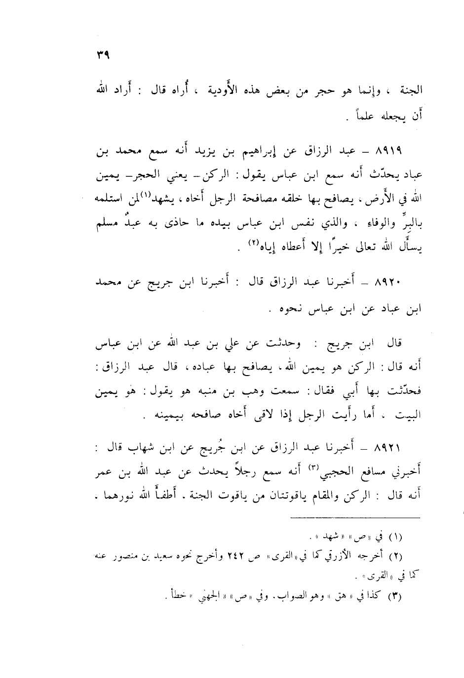 قَالَ ابْنُ جُرَيْجٍ: وَحُدِّثْتُ عَنْ عَلِيِّ بْنِ عَبْدِ اللَّهِ، عَنِ ابْنِ عَبَّاسٍ أَنَّهُ قَالَ: «الرُّكْنُ هُوَ يَمِينُ اللَّهِ يُصَافِحُ بِهَا عِبَادَهُ» قَالَ عَبْدُ الرَّزَّاقِ: فَحَدَّثْتُ بِهَا أَبِي فَقَالَ: سَمِعْتُ وَهْبَ بْنَ مُنَبِّهٍ هُوَ يَقُولُ: " هُوَ يَمِينُ الْبَيْتِ. أَمَا رَأَيْتَ الرَّجُلَ إِذَا لَاقَى أَخَاهُ صَافَحَهُ بِيَمِينِهِ