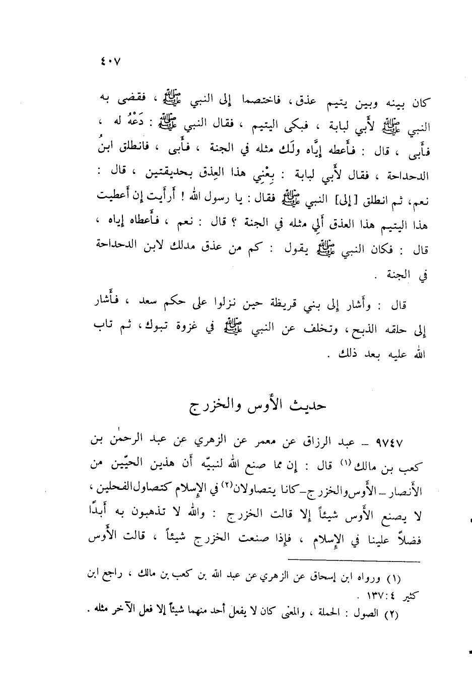 ٩٧٤٧ - عَنْ مَعْمَرٍ، عَنِ الزُّهْرِيِّ، عَنْ عَبْدِ الرَّحْمَنِ بْنِ كَعْبِ بْنِ مَالِكٍ قَالَ: " إِنَّ مِمَّا صَنَعَ اللَّهُ لِنَبِيِّهِ أَنَّ هَذَيْنِ الْحَيَّيْنِ مِنَ الْأَنْصَارِ ـ الْأَوْسَ وَالْخَزْرَجَ ـ كَانَا يَتَصَاوَلَانِ فِي الْإِسْلَامِ كَتَصَاوُلِ الْفَحْلَيْنِ لَا يَصْنَعُ الْأَوْسُ شَيْئًا إِلَّا قَالَتِ الْخَزْرَجُ: وَاللَّهِ لَا تَذْهَبُونَ بِهِ أَبَدًا فَضْلًا عَلَيْنَا فِي الْإِسْلَامِ، فَإِذَا صَنَعْتِ الْخَزْرَجُ شَيْئًا، قَالَتِ الْأَوْسُ ⦗٤٠٨⦘ مِثْلَ ذَلِكَ، فَلَمَّا أَصَابَتِ الْأَوْسُ كَعْبَ بْنَ الْأَشْرَفِ قَالَتِ الْخَزْرَجُ: وَاللَّهِ لَا نَنْتَهِي حَتَّى نُجْزِئَ عَنْ رَسُولِ اللَّهِ صَلَّى اللهُ عَلَيْهِ وَسَلَّمَ مِثْلَ الَّذِي أَجْزَءُوا عَنْهُ فَتَذَاكَرُوا أَوْزَنَ رَجُلٍ مِنَ الْيَهُودِ فَاسْتَأْذَنُوا النَّبِيَّ صَلَّى اللهُ عَلَيْهِ وَسَلَّمَ فِي قَتْلِهِ، وَهُوَ سَلَّامُ بْنُ أَبِي الْحُقَيْقِ الْأَعْوَرُ أَبُو رَافِعٍ بِخَيْبَرَ فَأَذِنَ لَهُمْ فِي قَتَلَهِ وَقَالَ: «لَا تَقْتُلُوا وَلِيدًا وَلَا امْرَأَةً» فَخَرَجَ إِلَيْهِمْ رَهْطٌ فِيهِمْ عَبْدُ اللَّهِ بْنُ عَتِيكٍ، وَكَانَ أَمِيرُ الْقَوْمِ أَحَدُ بَنِي سَلِمَةَ، وَعَبْدُ اللَّهِ بْنُ أُنَيْسٍ، وَمَسْعُودُ بْنُ سِنَانَ، وَأَبُو قَتَادَةَ، وَخُزَاعِيُّ بْنُ أَسْوَدَ، رَجُلٌ مِنْ أَسْلَمَ حَلِيفٌ لَهُمْ، وَرَجُلٌ آخَرُ يُقَالُ لَهُ فُلَانُ بْنُ سَلَمَةَ فَخَرَجُوا حَتَّى جَاءُوا خَيْبَرَ، فَلَمَّا دَخَلُوا الْبَلَدَ عَمَدُوا إِلَى كُلِّ بَيْتٍ مِنْهَا، فَغَلَّقُوهُ مِنْ خَارِجِهِ عَلَى أَهْلِهِ، ثُمَّ أَسْنَدُوا إِلَيْهِ فِي مَشْرَبَةٍ لَهُ فِي عَجَلَةٍ مِنْ نَخْلٍ، فَأَسْنَدُوا فِيهَا حَتَّى ضَرَبُوا عَلَيْهِ بَابَهُ فَخَرَجَتْ إِلَيْهِمُ امْرَأَتَهُ فَقَالَتْ: مِمَّنْ أَنْتُمْ؟ فَقَالُوا: نَفَرٌ مِنَ الْعَرَبِ أَرَدْنَا الْمِيرَةَ قَالَتْ: هَذَا الرَّجُلُ فَادْخُلُوا عَلَيْهِ فَلَمَّا دَخَلُوا عَلَيْهِ أَغْلَقُوا عَلَيْهِمَا الْبَابَ، ثُمَّ ابْتَدَرُوهُ بِأَسْيَافِهِمْ، قَالَ قَائِلُهُمْ: وَاللَّهِ مَا دَلَّنِي عَلَيْهِ إِلَّا بَيَاضُهُ عَلَى الْفِرَاشِ فِي سَوَادِ اللَّيْلِ كَأَنَّهُ قُبْطِيَّةٌ مُلْقَاةٌ قَالَ: وَصَاحَتْ بِنَا امْرَأَتُهُ قَالَ: فَيَرْفَعِ الرَّجُلُ مِنَّا السَّيْفَ لِيَضْرِبَهَا بِهِ ⦗٤٠٩⦘، ثُمَّ يَذْكُرُ نَهْيَ النَّبِيِّ صَلَّى اللهُ عَلَيْهِ وَسَلَّمَ قَالَ: وَلَوْلَا ذَلِكَ فَرَغْنَا مِنْهَا بِلَيْلٍ قَالَ: وَتَحَامَلَ عَبْدُ اللَّهِ بْنُ أُنَيْسٍ بِسَيْفِهِ فِي بَطْنِهِ حَتَّى أَنْفَذَهُ، وَكَانَ سَيِّئَ الْبَصَرِ فَوَقَعَ مِنَ فوق الْعَجَلَةِ فَوُثِيَتْ رِجْلُهُ وَثْيًا مُنْكَرًا قَالَ: فَنَزَلْنَا فَاحْتَمَلْنَاهُ فَانْطَلَقْنَا بِهِ مَعَنَا حَتَّى انْتَهَيْنَا إِلَى مَنْهَرِ عَيْنٍ مِنْ تِلْكَ الْعُيُونِ فَمَكَثْنَا فِيهِ قَالَ: وَأَوْقَدُوا النِّيرَانَ، وَأَشْعَلُوهَا فِي السَّعَفِ، وَجَعَلُوا يَلْتَمِسُونَ وَيَشْتَدُّونَ، وَأَخْفَى اللَّهُ عَلَيْهِمْ مَكَانَنَا قَالَ: ثُمَّ رَجَعُوا قَالَ: فَقَالَ بَعْضُ أَصْحَابِنَا: أَنَذْهَبُ فَلَا نَدْرِي أَمَاتَ عَدُوُّ اللَّهِ أَمْ لَا؟ قَالَ: فَخَرَجَ رَجُلٌ مِنَّا حَتَّى حُشِرَ فِي النَّاسِ فَدَخَلَ مَعَهُمْ فَوَجَدَ امْرَأَتَهُ مُكِبَّةً وَفِي يَدِهَا الْمِصْبَاحُ وَحَوْلَهُ رِجَالُ يَهُودَ فَقَالَ قَائِلٌ مِنْهُمْ: أَمَا وَاللَّهِ لَقَدْ سَمِعْتُ صَوْتَ ابْنِ عَتِيكٍ ثُمَّ أَكْذَبْتُ نَفْسِي فَقُلْتُ: وَأَنِّي ابْنُ عَتِيكٍ بِهَذِهِ الْبِلَادِ فَقَالَتْ شَيْئًا ثُمَّ رَفَعَتْ رَأْسَهَا فَقَالَتْ: فَاظَ وَإِلَهُ يَهُودَ ـ تَقُولُ مَاتَ ـ قَالَ: فَمَا سَمِعْتُ كَلِمَةً كَا