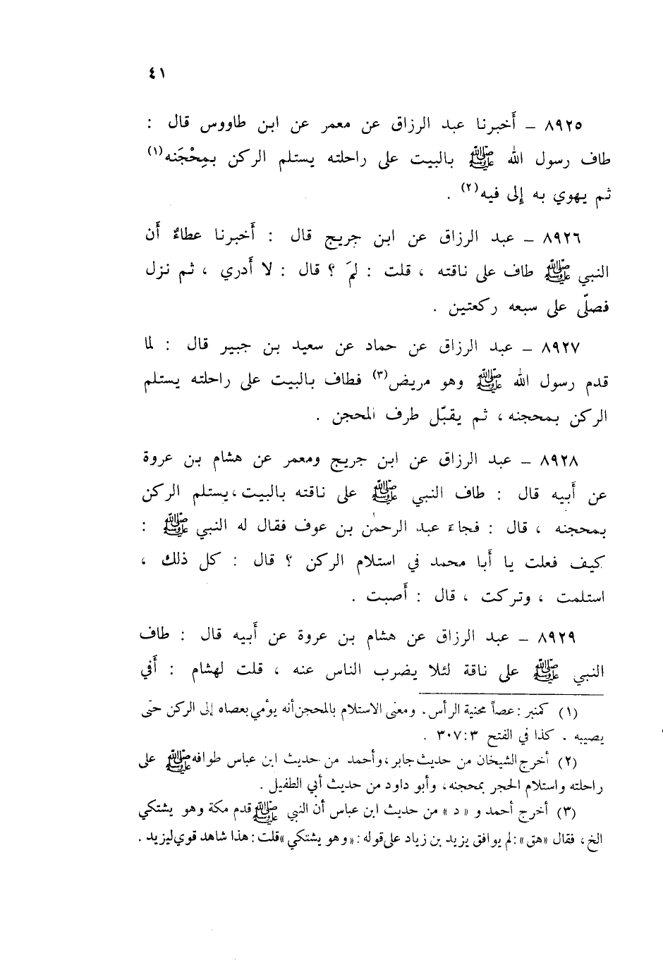 ٨٩٢٥ - أَخْبَرَنَا عَبْدُ الرَّزَّاقِ، عَنْ مَعْمَرٍ، عَنِ ابْنِ طَاوُسٍ قَالَ: «طَافَ رَسُولُ اللَّهِ صَلَّى اللهُ عَلَيْهِ وَسَلَّمَ بِالْبَيْتِ عَلَى رَاحِلَتِهِ يَسْتَلِمُ الرُّكْنَ بِمِحْجَنِهِ، ثُمَّ يَهْوِي بِهِ إِلَى فِيهِ»