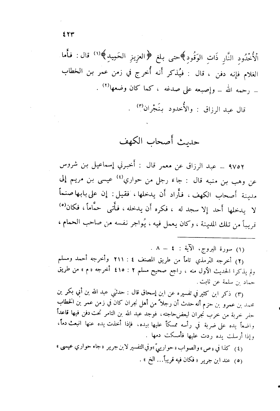 ٩٧٥٢ - عَنْ مَعْمَرٍ قَالَ: أَخْبَرَنِي إِسْمَاعِيلُ بْنُ شَرُوسٍ، عَنْ وَهْبِ بْنِ مُنَبِّهٍ قَالَ: " جَاءَ رَجُلٌ مِنْ حَوَارِيِّ عِيسَى ابْنِ مَرْيَمَ إِلَى مَدِينَةِ أَصْحَابِ الْكَهْفِ فَأَرَادَ أَنْ يَدْخُلَهَا، فَقِيلَ إِنَّ عَلَى بَابِهَا صَنَمًا لَا يَدْخُلُهَا أَحَدٌ إِلَّا سَجَدَ لَهُ، فَكَرِهَ أَنْ يَدْخُلَهُ فَأَتَى حَمَّامًا، فَكَانَ قَرِيبًا مِنْ تِلْكَ الْمَدِينَةِ، وَكَانَ يَعْمَلُ فِيهِ يُواجِرُ نَفْسَهُ مِنْ صَاحِبِ الْحَمَّامِ ⦗٤٢٤⦘، وَرَأَى صَاحِبُ الْحَمَّامِ فِي حَمَّامِهِ الْبَرَكَةَ وَالرِّفْقَ، وَفَوَّضَ إِلَيْهِ، وَجَعَلَ يَسْتَرْسِلُ إِلَيْهِ، وَعَلِقَهُ فِتْيَةٌ مِنْ أَهْلِ الْمَدِينَةِ، فَجَعَلَ يُخْبِرُهُمْ عَنْ خَبَرِ السَّمَاءِ وَالْأَرْضِ، وَخَبَرِ الْآخِرَةِ حَتَّى آمَنُوا بِهِ وَصَدَّقُوهُ، وَكَانُوا عَلَى مِثْلِ حَالِهِ فِي حُسْنِ الْهَيْئَةِ، وَكَانَ يَشْتَرِطُ عَلَى صَاحِبِ الْحَمَّامِ أَنَّ اللَّيْلَ لِي، وَلَا تَحَولُ بَيْنِي وَبَيْنَ الصَّلَاةِ إِذَا حَضَرَتْ، حَتَّى جَاءَ ابْنُ الْمَلِكِ بِامْرَأَةٍ يَدْخُلُ بِهَا الْحَمَّامَ، فَعَيَّرَهُ الْحَوَارِيُّ فَقَالَ: أَنْتَ ابْنُ الْمَلِكِ، وَتَدْخُلُ مَعَكَ هَذِهِ الْكَذَا وَكَذَا، فَاسْتَحْيَى فَذَهَبَ فَرَجَعَ مَرَّةً أُخْرَى، فَقَالَ لَهُ مِثْلَ ذَلِكَ فَسَبَّهُ وَانْتَهَرَهُ، وَلَمْ يَلْتَفِتْ حَتَّى دَخَلَ، وَدَخَلَتْ مَعَهُ الْمَرْأَةُ فَبَاتَا فِي الْحَمَّامِ فَمَاتَا فِيهِ، فَأُتِيَ الْمَلِكُ فَقِيلَ لَهُ قَتَلَ صَاحِبُ الْحَمَّامِ ابْنَكَ، فَالْتُمِسَ فَلَمْ يُقْدَرْ عَلَيْهِ، وَهَرَبَ فَقَالَ: مَنْ كَانَ يَصْحَبُهُ، فَسَمُّوا الْفِتْيَةَ فَخَرَجُوا مِنَ الْمَدِينَةِ فَمَرُّوا بِصَاحِبٍ لَهُمْ فِي زَرْعٍ لَهُ، وَهُوَ عَلَى مِثْلِ أَمْرِهِمْ فَذَكَرُوا لَهُ أَنَّهُمُ الْتُمِسُوا فَانْطَلَقَ مَعَهُمْ وَمَعَهُ كَلْبٌ حَتَّى أَوَاهُمُ اللَّيْلُ إِلَى كَهْفٍ، فَدَخَلُوا فِيهِ فَقَالُوا: نَبِيتُ هَاهُنَا اللَّيْلَةَ، ثُمَّ نُصْبِحُ إِنْ شَاءَ اللَّهُ ثُمَّ تَرَوْنَ رَأْيَكُمْ قَالَ: فَضُرِبَ عَلَى آذَانِهِمْ، فَخَرَجَ الْمَلِكُ ⦗٤٢٥⦘ بِأَصْحَابِهِ يَتْبَعُونَهُمْ حَتَّى وَجَدُوهُمْ، فَدَخَلُوا الْكَهْفَ، فَكُلَّمَا أَرَادَ الرَّجُلُ مِنْهُمْ أَنْ يَدْخُلَ أُرْعِبَ فَلَمْ يُطِقْ أَحَدٌ أَنْ يَدْخُلَ فَقَالَ لَهُ قَائِلٌ: أَلَسْتَ قُلْتَ: لَوْ كُنْتُ قَدَرْتُ عَلَيْهِمْ قَتَلَتُهُمْ؟ قَالَ: بَلَى قَالَ: فَابْنِ عَلَيْهِمْ بَابَ الْكَهْفِ، وَدَعْهُمْ فِيهِ يَمُوتُوا عَطَشًا وَجُوعًا، فَفَعَلَ، ثُمَّ غَبَرُوا زَمَانًا، ثُمَّ إِنَّ رَاعِي غَنْمٍ أَدْرَكَهُ الْمَطَرُ عِنْدَ الْكَهْفِ فَقَالَ: لَوْ فَتَحْتُ هَذَا الْكَهْفَ وَأَدْخَلْتُ غَنَمِي مِنَ الْمَطَرِ، فَلَمْ يَزَلْ يُعَالِجُهُ حَتَّى فَتَحَ لِغَنَمِهِ فَأَدْخَلَهَا فِيهِ وَرَدَّ اللَّهُ أَرْوَاحَهُمْ فِي أَجْسَادِهِمْ مِنَ الْغَدِ، حِينَ أَصْبَحُوا، فَبَعَثُوا أَحَدَهُمْ بِوَرِقٍ لِيَشْتَرِيَ لَهُمْ طَعَامًا، فَلَمَّا أَتَى بَابَ مَدِينَتِهِمْ جَعَلَ لَا يُرِي أَحَدًا مِنْ وَرِقِهِ شَيْئًا إِلَّا اسْتَنْكَرَهَا حَتَّى جَاءَ رَجُلًا فَقَالَ: بِعْنِي بِهَذِهِ الدَّرَاهِمِ طَعَامًا قَالَ: وَمِنْ أَيْنَ هَذِهِ الدَّرَاهِمُ؟ قَالَ: خَرَجْتُ أَنَا وَأَصْحَابٌ لِي أَمْسِ فَأَوَانَا اللَّيْلُ، ثُمَّ أَصْبَحْنَا فَأَرْسَلُونِي فَقَالَ: هَذِهِ الدَّرَاهِمُ كَانَتْ عَلَى عَهْدِ مَلِكِ فُلَانٍ، فَأَنَّى لَكَ هَذِهِ الدَّرَاهِمُ؟ فَرَفَعَهُ إِلَى الْمَلِكِ، وَكَانَ رَجُلًا صَالِحًا فَقَالَ مِنْ أَيْنَ لَكَ هَذِهِ الْوَرِقُ؟ ⦗٤٢٦⦘ قَالَ: خَرَجْتُ أَنَا وَأَصْحَابٌ لِي أَمْسِ حَتَّى أَدْرَكَنَا اللَّيْلُ فِي 