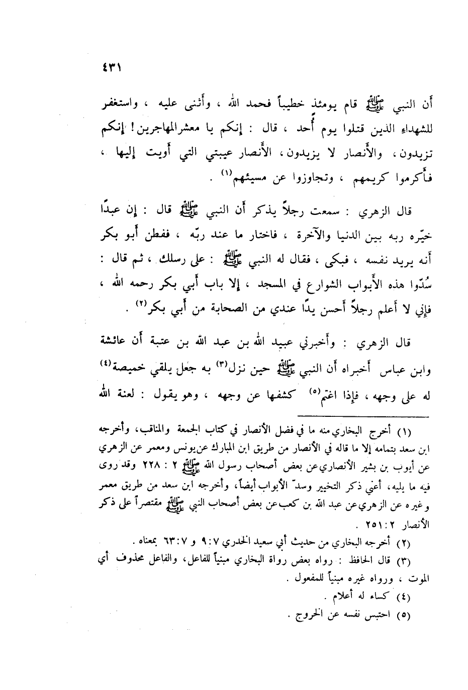 قَالَ الزُّهْرِيُّ: سَمِعْتُ رَجُلًا يَذْكُرُ أَنَّ النَّبِيَّ صَلَّى اللهُ عَلَيْهِ وَسَلَّمَ قَالَ: «إِنَّ عَبْدًا خَيَّرَهُ رَبُّهُ بَيْنَ الدُّنْيَا وَالْآخِرَةِ فَاخْتَارَ مَا عِنْدَ رَبِّهِ»، فَفَطِنَ أَبُو بَكْرٍ أَنَّهُ يُرِيدُ نَفْسَهُ فَبَكَى، فَقَالَ لَهُ النَّبِيُّ صَلَّى اللهُ عَلَيْهِ وَسَلَّمَ: «عَلَى رِسْلِكَ»، ثُمَّ قَالَ: «سُدُّوا هَذِهِ الْأَبْوَابَ الشَّوَارِعَ فِي الْمَسْجِدِ إِلَّا بَابَ أَبِي بَكْرٍ رَحِمَهُ اللَّهُ، فَإِنِّي لَا أَعْلَمُ رَجُلًا أَحْسَنَ يَدًا عِنْدِي مِنَ الصَّحَابَةِ مِنْ أَبِي بَكْرٍ»
