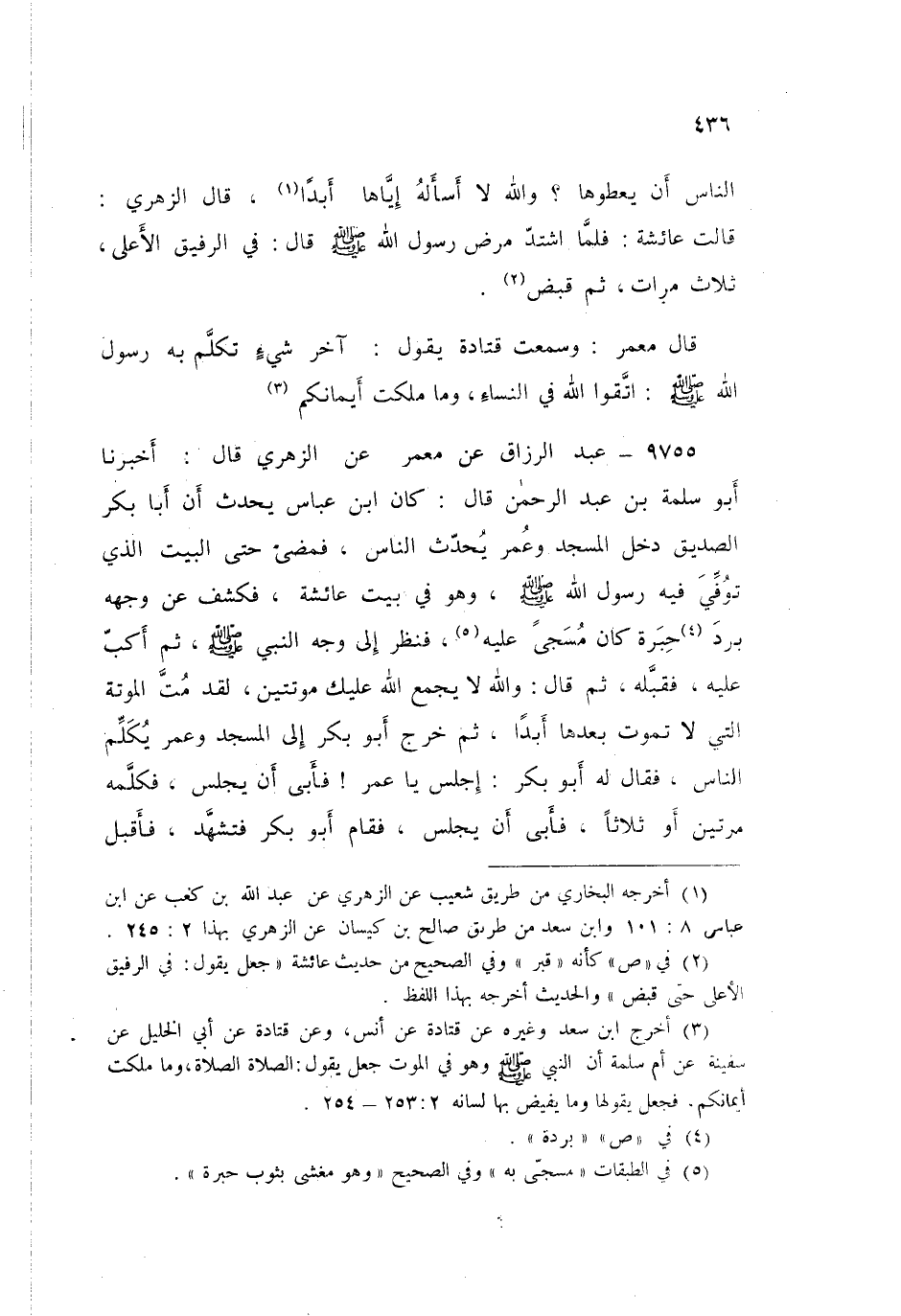 ٩٧٥٥ - عَنْ مَعْمَرٍ، عَنِ الزُّهْرِيِّ قَالَ: أَخْبَرَنَا أَبُو سَلَمَةَ بْنُ عَبْدِ الرَّحْمَنِ قَالَ: كَانَ ابْنُ عَبَّاسٍ يُحَدِّثُ: أَنَّ أَبَا بَكْرٍ الصِّدِّيقَ، دَخَلَ الْمَسْجِدَ وَعُمَرُ يُحَدِّثُ النَّاسَ، فَمَضَى حَتَّى الْبَيْتِ الَّذِي تُوُفِّي فِيهِ رَسُولُ اللَّهِ صَلَّى اللهُ عَلَيْهِ وَسَلَّمَ وَهُوَ فِي بَيْتِ عَائِشَةَ، فَكَشَفَ عَنْ وَجْهِهِ بُرْدَ حِبَرَةٍ كَانَ مُسَجًّى عَلَيْهِ، فَنَظَرَ إِلَى وَجْهِ النَّبِيِّ صَلَّى اللهُ عَلَيْهِ وَسَلَّمَ، ثُمَّ أَكَبَّ عَلَيْهِ فَقَبَّلَهُ، ثُمَّ قَالَ: «وَاللَّهِ لَا يَجْمَعُ اللَّهُ عَلَيْكَ مَوْتَتَيْنِ، لَقَدْ مُتَّ الْمَوْتَةَ الَّتِي لَا تَمُوتُ بَعْدَهَا أَبَدًا»، ثُمَّ خَرَجَ أَبُو بَكْرٍ إِلَى الْمَسْجِدِ، وَعُمَرُ يُكَلِّمُ النَّاسَ فَقَالَ لَهُ أَبُو بَكْرٍ: «اجْلِسْ يَا عُمَرُ»، فَأَبَى أَنْ يَجْلِسَ، فَكَلَّمَهُ مَرَّتَيْنِ أَوْ ثَلَاثًا، فَأَبَى أَنْ يَجْلِسَ، فَقَامَ أَبُو بَكْرٍ فَتَشَهَّدَ، فَأَقْبَلَ ⦗٤٣٧⦘ النَّاسُ عَلَى أَبِي بَكْرٍ وَتَرَكُوا عُمَرَ، فَلَمَّا قَضَى أَبُو بَكْرٍ تَشَهُّدَهُ قَالَ: «أَمَّا بَعْدُ فَمَنْ كَانَ يَعْبُدَ مُحَمَّدًا فَإِنَّ مُحَمَّدًا قَدْ مَاتَ، وَمَنْ كَانَ مِنْكُمْ يَعْبُدُ اللَّهَ فَإِنَّ اللَّهَ حَيٌّ لَمْ يَمُتْ». ثُمَّ تَلَا هَذِهِ الْآيَةَ: {وَمَا مُحَمَّدٌ إِلَّا رَسُولٌ قَدْ خَلَتْ مِنْ قَبْلِهِ الرُّسُلُ} [آل عمران: ١٤٤] " الْآيَةَ كُلَّهَا، فَلَمَّا تَلَاهَا أَبُو بَكْرٍ رَحِمَهُ اللَّهُ أَيْقَنَ النَّاسُ بِمَوْتِ رَسُولِ اللَّهِ صَلَّى اللهُ عَلَيْهِ وَسَلَّمَ، وَتَلَقَّوْهَا مِنْ أَبِي بَكْرٍ حَتَّى قَالَ قَائِلٌ مِنَ النَّاسِ: فَلَمْ يَعْلَمُوا أَنَّ هَذِهِ الْآيَةَ أُنْزِلَتْ حَتَّى تَلَاهَا أَبُو بَكْرٍ