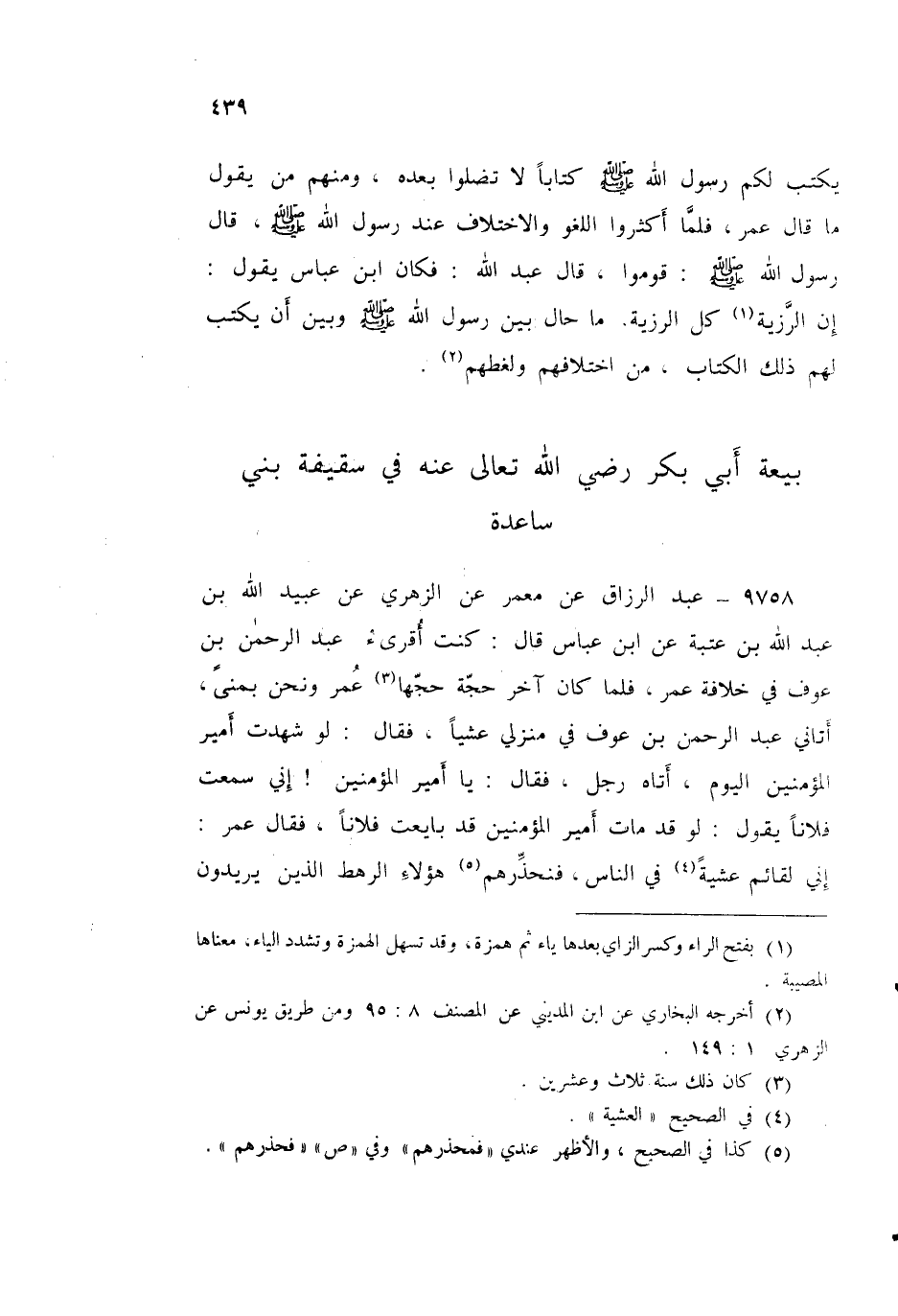 ٩٧٥٨ - عَنْ مَعْمَرٍ، عَنِ الزُّهْرِيِّ، عَنْ عُبَيْدِ اللَّهِ بْنِ عَبْدِ اللَّهِ بْنِ عُتْبَةَ، عَنِ ابْنِ عَبَّاسٍ قَالَ: كُنْتُ أُقْرِئُ عَبْدَ الرَّحْمَنِ بْنَ عَوْفٍ فِي خِلَافَةِ عُمَرَ، فَلَمَّا كَانَ آخِرُ حَجَّةٍ حَجَّهَا عُمَرُ - وَنَحْنُ بِمِنًى - أَتَانِي عَبْدُ الرَّحْمَنِ بْنُ عَوْفٍ فِي مَنْزِلِي عَشِيًّا، فَقَالَ: لَوْ شَهِدْتَ أَمِيرَ الْمُؤْمِنِينَ الْيَوْمَ أَتَاهُ رَجُلٌ فَقَالَ: يَا أَمِيرَ الْمُؤْمِنِينَ إِنِّي سَمِعْتُ فُلَانًا يَقُولُ: لَوْ قَدْ مَاتَ أَمِيرُ الْمُؤْمِنِينَ قَدْ بَايَعْتُ فُلَانًا فَقَالَ عُمَرُ: إِنِّي لَقَائِمٌ عَشِيَّةً فِي النَّاسِ فَنُحَذِّرُهُمْ هَؤُلَاءِ الرَّهْطَ الَّذِينَ يُرِيدُونَ ⦗٤٤٠⦘ أَنْ يَغْتَصِبُوا الْمُسْلِمِينَ أَمَرَهُمْ " قَالَ: فَقُلْتُ يَا أَمِيرَ الْمُؤْمِنِينَ، إِنَّ الْمَوْسِمَ يَجْمَعُ رَعَاعَ النَّاسِ وَغَوْغَاءَهُمْ، وَإِنَّهُمُ الَّذِينَ يَغْلِبُونَ عَلَى مَجْلِسِكَ، وَإِنِّي أَخْشَى إِنْ قُلْتَ فِيهِمُ الْيَوْمَ مَقَالَةً أَنْ يَطِيرُوا بِهَا كُلَّ مَطِيرٍ وَلَا يَعُوهَا، وَلَا يَضَعُوهَا عَلَى مَوَاضِعِهَا، وَلَكِنْ أَمْهِلْ يَا أَمِيرَ الْمُؤْمِنِينَ حَتَّى تَقْدُمَ الْمَدِينَةَ، فَإِنَّهَا دَارُ السُّنَّةِ وَالْهِجْرَةِ، وَتَخْلُصَ بِالْمُهَاجِرِينَ وَالْأَنْصَارِ فَتَقُولَ مَا قُلْتَ مُتَمَكِّنًا فَيَعُوا مَقَالَتَكَ وَيَضَعُوهَا عَلَى مَوَاضِعِهَا. قَالَ: فَقَالَ عُمَرُ: أَمَا وَاللَّهِ إِنْ شَاءَ اللَّهُ لَأَقُومَنَّ بِهِ فِي أَوَّلِ مَقَامٍ أَقُومُهُ فِي الْمَدِينَةِ " قَالَ: فَلَمَّا قَدِمْنَا الْمَدِينَةَ وَجَاءَ الْجُمُعَةُ هَجَّرْتُ لَمَّا حَدَّثَنِي عَبْدُ الرَّحْمَنِ بْنُ عَوْفٍ، فَوَجَدْتُ سَعِيدَ بْنَ زَيْدٍ قَدْ سَبَقَنِي بِالتَّهْجِيرِ جَالِسًا إِلَى جَنْبِ الْمِنْبَرِ فَجَلَسْتُ إِلَى جَنْبِهِ - تَمَسُّ رُكْبَتِي رُكْبَتَهُ قَالَ: فَلَمَّا زَالَتِ الشَّمْسُ خَرَجَ عَلَيْنَا عُمَرُ رَحِمَهُ اللَّهُ قَالَ فَقُلْتُ وَهُوَ مُقْبِلٌ: أَمَا وَاللَّهِ لَيَقُولَنَّ أَمِيرُ الْمُؤْمِنِينَ عَلَى هَذَا الْمِنْبَرِ مَقَالَةً لَمْ يَقُلْ قَبْلَهُ، قَالَ فَغَضِبَ سَعِيدُ بْنُ زَيْدٍ وَقَالَ: وَأَيُّ مَقَالَةٍ يَقُولُ لَمْ يَقُلْ قَبْلَهُ؟ قَالَ ⦗٤٤١⦘: فَلَمَّا ارْتَقَى عُمَرُ الْمِنْبَرَ أَخَذَ الْمُؤَذِّنُ فِي أَذَانِهِ، فَلَمَّا فَرَغَ مِنْ أَذَانِهِ قَامَ عُمَرُ فَحَمِدَ اللَّهَ وَأَثْنَى عَلَيْهِ بِمَا هُوَ أَهْلُهُ ثُمَّ قَالَ: أَمَّا بَعْدُ، فَإِنِّي أُرِيدُ أَنْ أَقُولَ مَقَالَةً قَدْ قُدِّرَ لِي أَنْ أَقُولَهَا، لَا أَدْرِي لَعَلَّهَا بَيْنَ يَدَيْ أَجَلِي: إِنَّ اللَّهَ بَعَثَ مُحَمَّدًا صَلَّى اللهُ عَلَيْهِ وَسَلَّمَ بِالْحَقِّ وَأَنْزَلَ مَعَهُ الْكِتَابَ، فَكَانَ مِمَّا أَنْزَلَ اللَّهُ عَلَيْهِ آيَةَ الرَّجْمِ، فَرَجَمَ رَسُولُ اللَّهِ صَلَّى اللهُ عَلَيْهِ وَسَلَّمَ وَرَجَمْنَا بَعْدَهُ، وَإِنِّي خَائِفٌ أَنْ يَطُولَ بِالنَّاسِ زَمَانٌ فَيَقُولُ قَائِلٌ: وَاللَّهِ مَا الرَّجْمُ فِي كِتَابِ اللَّهِ؟ فَيَضِلَّ أَوْ يَتْرُكَ فَرِيضَةً أَنْزَلَهَا اللَّهُ، أَلَا وَإِنَّ الرَّجْمَ حَقٌّ عَلَى مَنْ زَنَى إِذَا أُحْصِنَ وَقَامَتِ الْبَيِّنَةُ وَكَانَ الْحَمْلُ أَوِ الِاعْتِرَافُ، ثُمَّ قَدْ كُنَّا نَقْرَأُ: «وَلَا تَرْغَبُوا عَنْ آبَائِكُمْ فَإِنَّهُ كُفْرٌ بِكُمْ» أَوْ فَإِنَّ كُفْرًا بِكُمْ أَنْ تَرْغَبُوا عَنْ آبَائِكُمْ "، ثُمَّ إِنَّ رَسُولَ اللَّهِ صَلَّى اللهُ عَلَيْهِ وَسَلَّمَ قَالَ: " لَا تُطْرُونِي كَمَا أَطْرَتِ النَّصَارَى ابْنَ مَرْيَمَ صَلَوَاتُ اللَّهِ عَلَيْهِ، فَإِنَّمَا أَنَا عَبْدُ اللَّهِ فَقُولُوا: عَبْدُ اللَّهِ وَرَسُولُهُ "، ثُمَّ إِنَّهُ ب