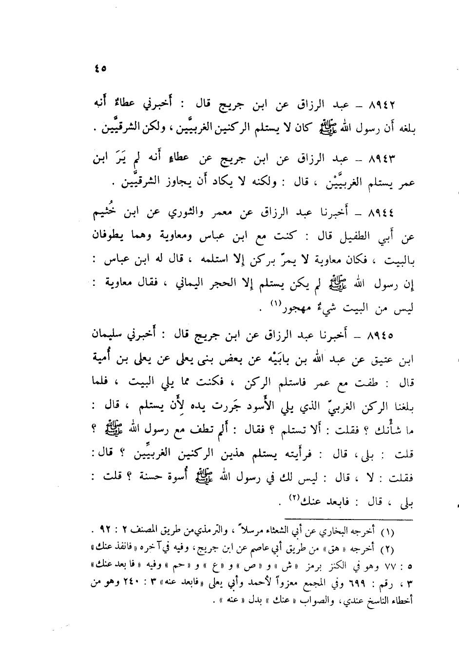 ٨٩٤٤ - أَخْبَرَنَا عَبْدُ الرَّزَّاقِ، أَخْبَرَنَا عَنْ مَعْمَرٍ، وَالثَّوْرِيِّ، عَنِ ابْنِ خُثَيْمٍ، عَنْ أَبِي الطُّفَيْلِ قَالَ: كُنْتُ مَعَ ابْنِ عَبَّاسٍ وَمُعَاوِيَةَ وَهُمَا يَطُوفَانِ بِالْبَيْتِ، فَكَانَ مُعَاوِيَةَ لَا يَمُرُّ بِرُكْنٍ إِلَّا اسْتَلَمَهُ قَالَ لَهُ ابْنُ عَبَّاسٍ: «إِنَّ رَسُولَ اللَّهِ صَلَّى اللهُ عَلَيْهِ وَسَلَّمَ لَمْ يَكُنْ يَسْتَلِمُ إِلَّا الْحَجَرَ الْيَمَانِيَّ» فَقَالَ مُعَاوِيَةُ: «لَيْسَ مِنَ الْبَيْتِ شَىءٌ مَهْجُورٌ»