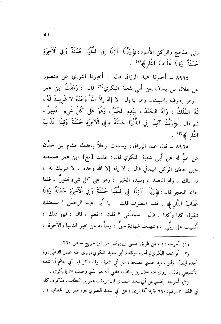 ٨٩٦٥ - قَالَ عَبْدُ الرَّزَّاقِ: وَسَمِعْتُ رَجُلًا يُحَدِّثُ هِشَامَ بْنَ حَسَّانَ، عَنْ عَمٍّ لَهُ، عَنْ أَبِي شُعْبَةَ الْبَكْرِيِّ قَالَ: طُفْتُ مَعَ ابْنِ عُمَرَ فَسَمِعْتُهُ حِينَ حَاذَى الرُّكْنَ الْيَمَانِيَّ قَالَ: «لَا إِلَهَ إِلَّا اللَّهُ وَحْدَهُ لَا شَرِيكَ لَهُ، لَهُ الْمُلْكُ وَلَهُ الْحَمْدُ وَبِيَدِهِ الْخَيْرُ وَهُوَ عَلَى كُلِّ شَيْءٍ قَدِيرٌ، فَلَمَّا جَاءَ الْحَجَرَ» قَالَ: " {ربَّنَا آتِنَا فِي الدُّنْيَا حَسَنَةً وَفِي الْآخِرَةِ حَسَنَةً وَقِنَا عَذَابَ النَّارِ} [البقرة: ٢٠١] " فَلَمَّا انْصَرَفَ قُلْتُ: يَا أَبَا عَبْدِ الرَّحْمَنِ، سَمِعْتُكَ تَقُولُ كَذَا وَكَذَا قَالَ: «سَمِعْتَنِي؟» قُلْتُ: نَعَمْ. قَالَ: «فَهُوَ ذَلِكَ أَثْنَيْتُ عَلَى رَبِّي، وَشَهِدْتُ شَهَادَةَ حَقٍّ، وَسَأَلْتُهُ مِنْ خَيْرِ الدُّنْيَا وَالْآخِرَةِ» ⦗٥٢⦘، فَدَعَا هِشَامُ بِدَوَاةٍ فَكَتَبَهُ