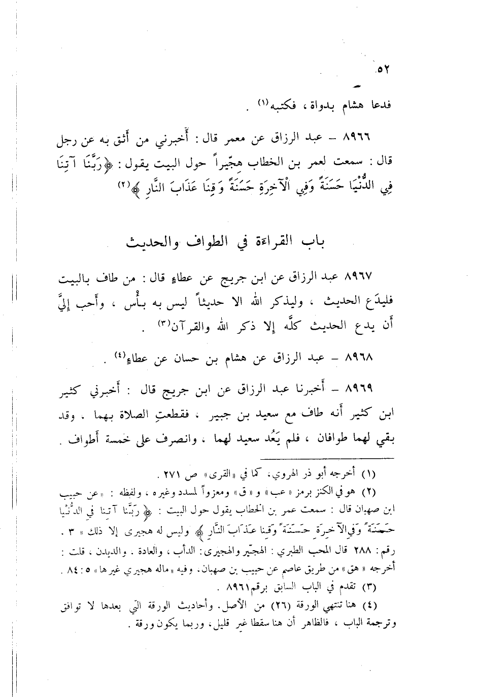 ٨٩٦٧ - عَنِ ابْنِ جُرَيْجٍ، عَنْ عَطَاءٍ قَالَ: «مَنْ طَافَ بِالْبَيْتِ فَلَيَدَعِ الْحَدِيثَ، وَلْيَذْكُرِ اللَّهَ، إِلَّا حَدِيثًا لَيْسَ بِهِ بَأْسٌ، وَأَحَبُّ إِلَيَّ أَنْ يَدَعَ الْحَدِيثَ كُلَّهُ، إِلَّا ذِكْرَ اللَّهِ وَالْقُرَآنَ» عَبْدُ الرَّزَّاقِ،