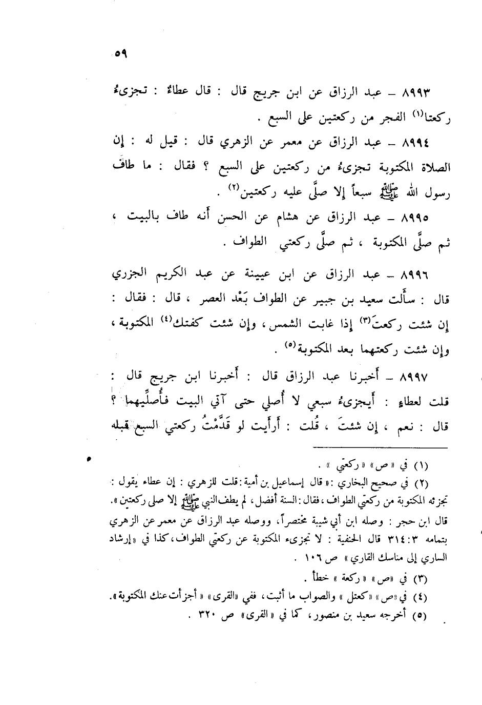 ٨٩٩٤ - عَنْ مَعْمَرٍ، عَنِ الزُّهْرِيِّ قَالَ: قِيلَ لَهُ: إنَّ الصَّلَاةَ الْمَكْتُوبَةَ تُجْزِئُ مِنْ رَكْعَتَيْنِ عَلَى السَّبْعِ، فَقَالَ: «مَا طَافَ رَسُولُ اللَّهِ صَلَّى اللهُ عَلَيْهِ وَسَلَّمَ سَبْعًا إِلَّا صَلَّى عَلَيْهِ رَكْعَتَيْنِ»