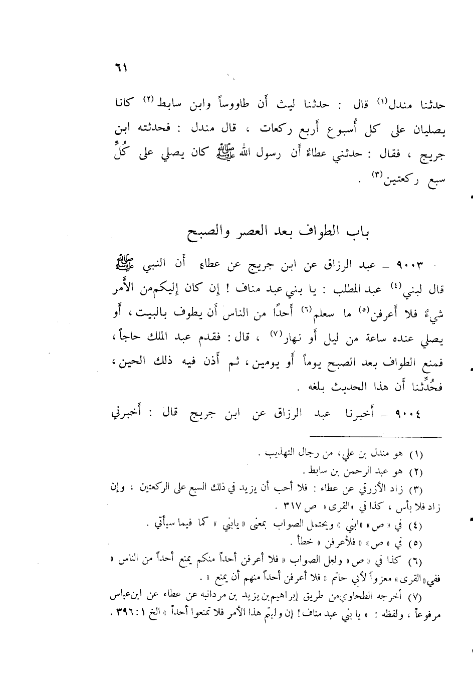 ٩٠٠٣ - عَنِ ابْنِ جُرَيْجٍ، عَنْ عَطَاءٍ، أَنَّ النَّبِيَّ صَلَّى اللهُ عَلَيْهِ وَسَلَّمَ قَالَ لِبَنِي عَبْدِ الْمُطَّلِبِ: «يَا بَنِي عَبْدِ مَنَافٍ، إِنْ كَانَ إِلَيْكُمْ مِنَ الْأَمْرِ شَيْءٌ فَلَا أَعْرِفَنَّ أَحَدًا مِنْكُمْ يَمْنَعُ أَحَدًا مِنَ النَّاسِ أَنْ يَطُوفَ بِالْبَيْتِ، أَوْ يُصَلِّيَ عِنْدَهُ سَاعَةً مِنْ لَيْلٍ أَوْ نَهَارٍ» قَالَ: «فَقَدِمَ عَبْدُ الْمَلِكِ حَاجًّا، فَمَنَعَ الطَّوَافَ بَعْدَ الصُّبْحِ يَوْمًا أَوْ يَوْمَيْنِ، ثُمَّ أَذِنَ فِيهِ ذَلِكَ الْحِينُ، فَحُدِّثْنِا أَنَّ هَذَا الْحَدِيثَ بَلَغَهُ»