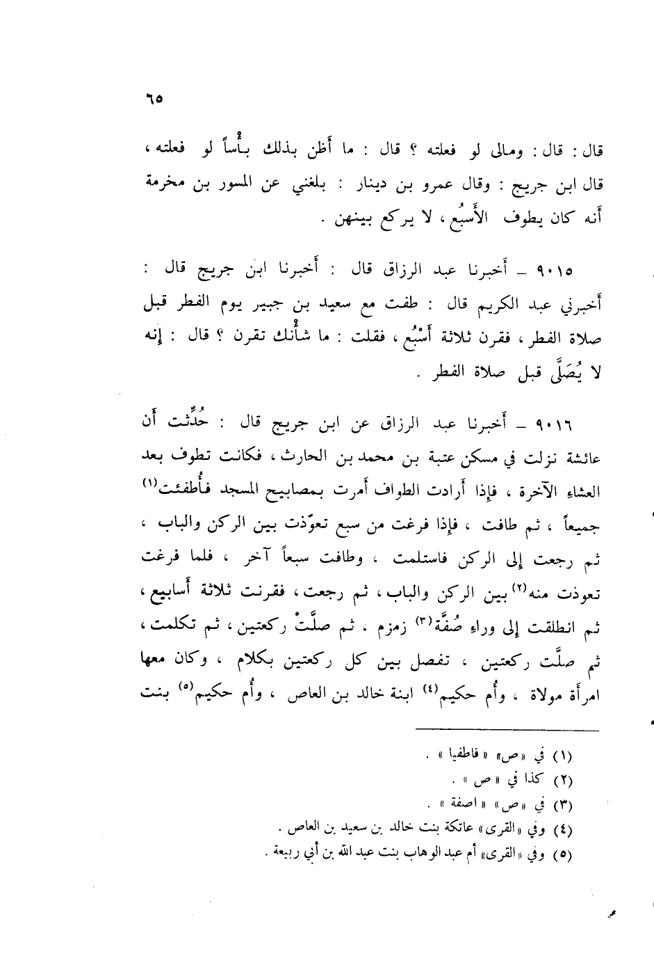 ٩٠١٦ - أَخْبَرَنَا عَبْدُ الرَّزَّاقِ، عَنِ ابْنِ جُرَيْجٍ قَالَ: حُدِّثْتُ أَنَّ عَائِشَةَ نَزَلَتْ فِي مَسْكَنِ عُتْبَةَ بْنِ مُحَمَّدِ بْنِ الْحَارِثِ، فَكَانَتْ تَطُوفَ بَعْدَ الْعِشَاءِ الْآخِرَةَ، فَإِذَا أَرَادَتِ الطَّوَافَ أَمَرَتْ بِمَصَابِيحَ الْمَسْجِدِ، فَأُطْفِئَتْ جَمِيعًا ثُمَّ طَافَتْ، فَإِذَا فَرَغَتْ مِنْ سَبْعٍ تَعَوَّذَتْ بَيْنَ الرُّكْنِ وَالْبَابِ، ثُمَّ رَجَعَتْ إِلَى الرُّكْنِ فَاسْتَلَمَتْ وَطَافَتْ سَبْعًا آخَرَ، فَلَمَّا فَرَغَتْ تَعَوَّذَتْ مِنْهُ بَيْنَ الرُّكْنِ وَالْبَابِ، ثُمَّ رَجَعَتْ فَقَرَنَتْ ثَلَاثَةَ أَسَابِيعَ، ثُمَّ انْطَلَقَتْ إِلَى وَرَاءِ صُفَّةِ زَمْزَمَ، ثُمَّ صَلَّتْ رَكْعَتَيْنِ، ثُمَّ تَكَلَّمَتْ، ثُمَّ صَلَّتْ رَكْعَتَيْنِ تَفْصِلُ بَيْنَ كُلِّ رَكْعَتَيْنِ بِكَلَامٍ، وَكَانَ مَعَهَا امْرَأَةٌ مَوْلَاةٌ وَأُمُّ حَكِيمِ ابْنَةُ خَالِدِ بْنِ الْعَاصِ، وَأُمُّ حَكِيمٍ بِنْتِ ⦗٦٦⦘ عَبْدِ اللَّهِ بْنِ أَبِي رَبِيعَةَ، قَالَتِ الْمَوْلَاةُ: فَتَذَاكَرْنَا حَسَّانَ، فَتَذَاكَرْنَا نَسَبَهُ فَقَالَتْ عَائِشَةَ: " ابْنُ الْفُرَيْعَةِ تَسُّرَهُ، فَنَهَتْنَا أَنْ نَسُبَّهُ، وَأَبْرَأَتْهُ أَنْ يَكُونَ مِمَّنِ افْتَرَى عَلَيْهَا وَقَالَتْ: " إنِّي لَأَرْجُو أَنْ يُدْخِلَهُ اللَّهُ الْجَنَّةَ بِقَوْلِهِ: