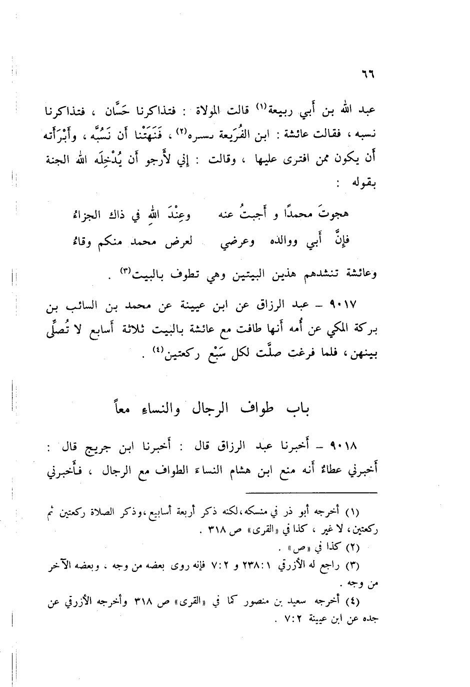 ٩٠١٨ - عَبْدُ الرَّزَّاقِ قَالَ: أَخْبَرَنَا ابْنُ جُرَيْجٍ قَالَ: أَخْبَرَنِي عَطَاءٌ، أَنَّهُ مَنَعَ ابْنُ هِشَامٍ النِّسَاءَ الطَّوَافَ مَعَ الرِّجَالِ، فَأَخْبَرَنِي ⦗٦٧⦘ وَقَالَ: كَيْفَ تَمْنَعْهُنَّ الطَّوَافَ؟ وَقَدْ طَافَ نِسَاءُ النَّبِيِّ صَلَّى اللهُ عَلَيْهِ وَسَلَّمَ مَعَ الرِّجَالِ. قُلْتُ: أَبَعَدَ الْحِجَابِ؟ قَالَ: إِي لَعَمْرِي أَدْرَكْتُ لَعَمْرِي بَعْدَ الْحِجَابِ، قُلْتُ: كَيْفَ يُخَالِطْنَ الرِّجَالَ؟ قَالَ: لَمْ يَكُنَّ يَفْعَلْنَ، كَانَتْ عَائِشَةُ تَطُوفُ حَجِزَةً مِنَ الرِّجَالِ لَا تُخَالِطُهُمْ، فَقَالَتِ امْرَأَةٌ مَعَهَا: انْطَلِقِي بِنَا يَا أُمَّ الْمُؤْمِنِينَ نَسْتَلِمُ فَجَذَبَتْهَا وَقَالَتْ: «انْطَلِقِي عَنْكِ» وَأَبَتْ أَنْ تَسْتَلِمَ، وَكُنَّ يَخْرُجْنَ مُسْتَتِرَاتٍ بِاللَّيْلِ، فَيَطُفْنَ مَعَ الرِّجَالِ لَا يُخَالِطْنَهُمْ قَالَ: وَلَكِنَّهُنَّ إِذَا دَخَلْنَ الْبَيْتَ سُتِرْنَ حِينَ يَدْخُلْنَ، ثُمَّ أُخِرِجَ عَنْهُ الرِّجَالُ قَالَ: وَكُنْتُ آتِي عَائِشَةَ أَنَا وَعُبَيْدُ بْنُ عُمَيْرٍ وَهِيَ مُجَاوِرَةٌ فِي جَوْفِ ثَبِيرٍ، قُلْتُ: فَمَا حِجَابُهَا حِينَئِذٍ؟ قَالَ: هِيَ فِي قُبَّةٍ لَهَا تُرْكِيَّةٍ عَلَيْهَا غِشَاءٌ لَهَا، بَيْنَنَا ⦗٦٨⦘ وَبَيْنَهَا قَالَ: وَلكن قَدْ رَأَيْتُ عَلَيْهَا دِرْعًا مُعَصْفَرًا وَأَنَا صَبِيٌّ "