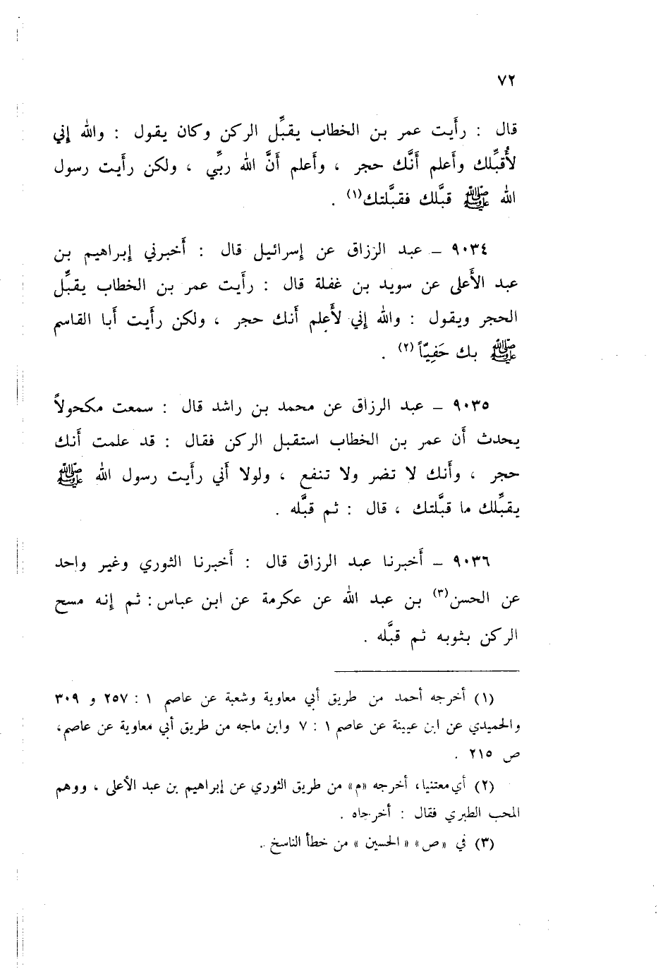 عَبْدُ الرَّزَّاقِ، عَنْ مُحَمَّدِ بْنِ رَاشِدٍ قَالَ: سَمِعْتُ مَكْحُولًا يُحَدِّثُ أَنَّ عُمَرَ بْنَ الْخَطَّابِ اسْتَقْبَلَ الرُّكْنَ فَقَالَ: «قَدْ عَلِمْتُ أَنَّكَ حَجَرٌ وَأَنَّكَ لَا تَضُرُّ وَلَا تَنْفَعُ وَلَوْلَا أَنِّي رَأَيْتُ رَسُولَ اللَّهِ صَلَّى اللهُ عَلَيْهِ وَسَلَّمَ يُقَبِّلُكَ مَا قَبَّلْتُكَ» قَالَ: ثُمَّ قَبَّلَهُ