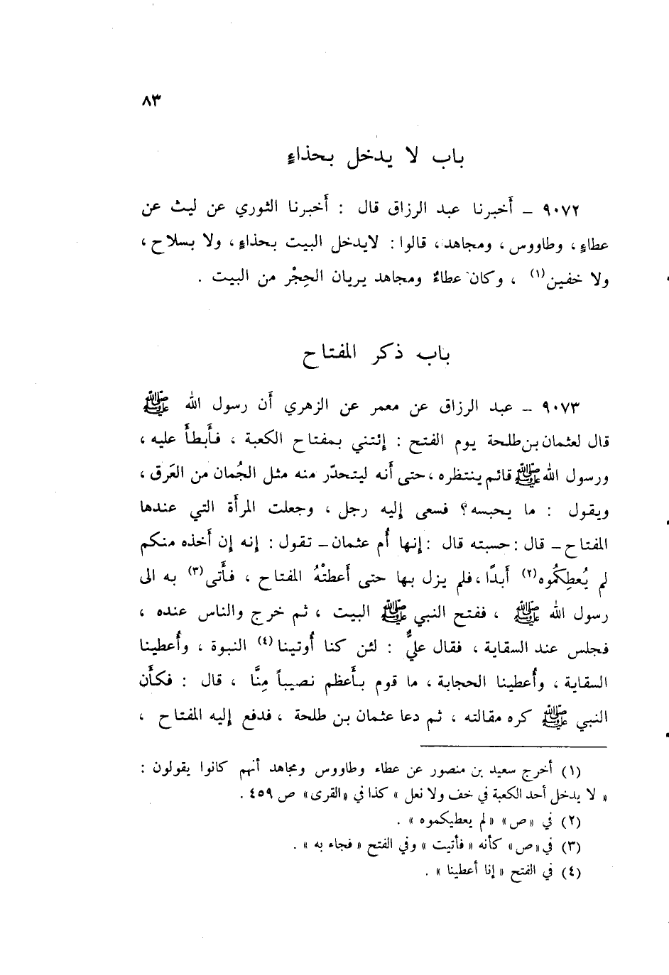 ٩٠٧٣ - عَنْ مَعْمَرٍ، عَنِ الزُّهْرِيِّ: أَنَّ رَسُولَ اللَّهِ صَلَّى اللهُ عَلَيْهِ وَسَلَّمَ قَالَ لِعُثْمَانَ بْنِ طَلْحَةَ يَوْمَ الْفَتْحِ: «إِئْتِنِي بِمِفْتَاحِ الْكَعْبَةِ» فَأَبْطَأَ عَلَيْهِ وَرَسُولُ اللَّهِ صَلَّى اللهُ عَلَيْهِ وَسَلَّمَ قَائِمٌ يَنْتَظِرُهُ، حَتَّى أَنَّهُ لَيَتَحَدَّرُ مِنْهُ مِثْلُ الْجُمَانِ مِنَ الْعَرَقِ وَيَقُولُ: مَا يَحْبِسُهُ؟ فَسَعَى إِلَيْهِ رَجُلٌ، وَجَعَلَتِ الْمَرْأَةُ الَّتِي عِنْدَهَا الْمِفْتَاحُ - قَالَ: حَسِبْتُهُ. قَالَ: إِنَّهَا أُمُّ عُثْمَانَ - تَقُولُ: إِنَّهُ إِنْ أَخَذَهُ مِنْكُمْ لَمْ يُعْطِكُمُوهُ أَبَدًا، فَلَمْ يَزَلْ بِهَا حَتَّى أَعْطَتْهُ الْمِفْتَاحَ، فَأَتَى بِهِ إِلَى رَسُولِ اللَّهِ صَلَّى اللهُ عَلَيْهِ وَسَلَّمَ، فَفَتَحَ النَّبِيُّ صَلَّى اللهُ عَلَيْهِ وَسَلَّمَ الْبَيْتَ، ثُمَّ خَرَجَ، وَالنَّاسُ عِنْدَهُ فَجَلَسَ عَنِد السِّقَايَةِ، فَقَالَ عَلِيٌّ: لَئِنْ كُنَّا أُوتِينَا النُّبُوَّةَ وَأُعْطِينَا السِّقَايَةَ، وَأُعْطِينَا الْحِجَابَةَ مَا قَوْمٌ بِأَعْظَمَ نَصِيبًا مِنَّا قَالَ: فَكَأَنَّ النَّبِيُّ صَلَّى اللهُ عَلَيْهِ وَسَلَّمَ كَرِهَ مَقَالَتَهُ، ثُمَّ دَعَا عُثْمَانَ بْنَ طَلْحَةَ فَدَفَعَ إِلَيْهِ الْمِفْتَاحَ ⦗٨٤⦘. وَقَالَ غَيِّبْهُ، فَحَدَّثْتُ بِهِ ابْنَ عُيَيْنَةَ فَقَالَ: أَخْبَرَنِي ابْنُ جُرَيْجٍ، عَنِ ابْنِ أَبِي مُلَيْكَةَ، أَنَّ النَّبِيَّ صَلَّى اللهُ عَلَيْهِ وَسَلَّمَ قَالَ لِعَلِيٍّ يَوْمَئِذٍ حِينَ كَلَّمَهُ فِي الْمِفْتَاحِ: «إِنَّمَا أَعْطَيْتُكُمْ مَا تُرْزَءُونَ، وَلَمْ أُعْطِكُمْ مَا تَرْزَءُونَ» يَقُولُ: «أَعْطَيْتُكُمُ السِّقَايَةَ لِأَنَّكُمْ تَغْرَمُونَ فِيهَا وَلَمْ أُعْطِكُمُ الْبَيْتَ، أَيْ أَنَّهُمْ بِأَخْذِهِ يَأْخُذُونَ مِنْ هَدِيَّتِهِ» قَوْلُ عَبْدِ الرَّزَّاقِ