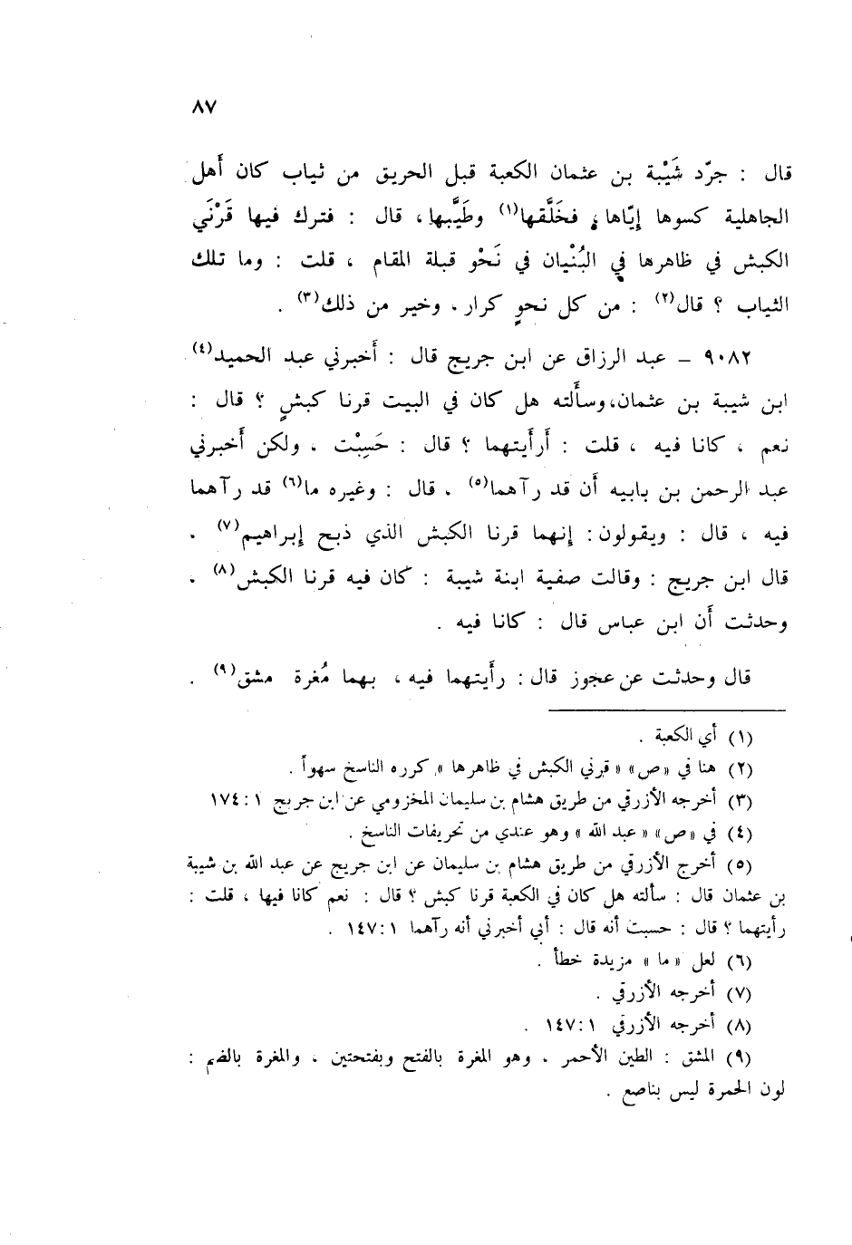٩٠٨٣ - عَنِ ابْنِ عُيَيْنَةَ، عَنْ مَنْصُورِ بْنِ صَفِيَّةَ، عَنْ خَالِهِ، عَنْ أُمِّهِ، عَنِ امْرَأَةٍ، مِنْ بَنِي سُلَيْمٍ قَالَتْ: سَأَلْتُ عُثْمَانَ: لِمَ أَرْسَلَ إِلَيْكَ النَّبِيُّ صَلَّى اللهُ عَلَيْهِ وَسَلَّمَ بَعْدَ خُرُوجِهِ مِنَ الْكَعْبَةِ؟ قَالَ: بَعَثَ إِلَيَّ، فَقَالَ: «إِنِّي رَأَيْتُ قَرْنَيِ الْكَبْشِ، فَلَمْ آمُرْكَ أَنْ تُخَمِّرَهَا فَإِنَّهُ لَا يَنْبَغِي أَنْ يَكُونَ فِي الْبَيْتِ شَيْءٌ يَشْغَلُ مُصَلِّيًا»