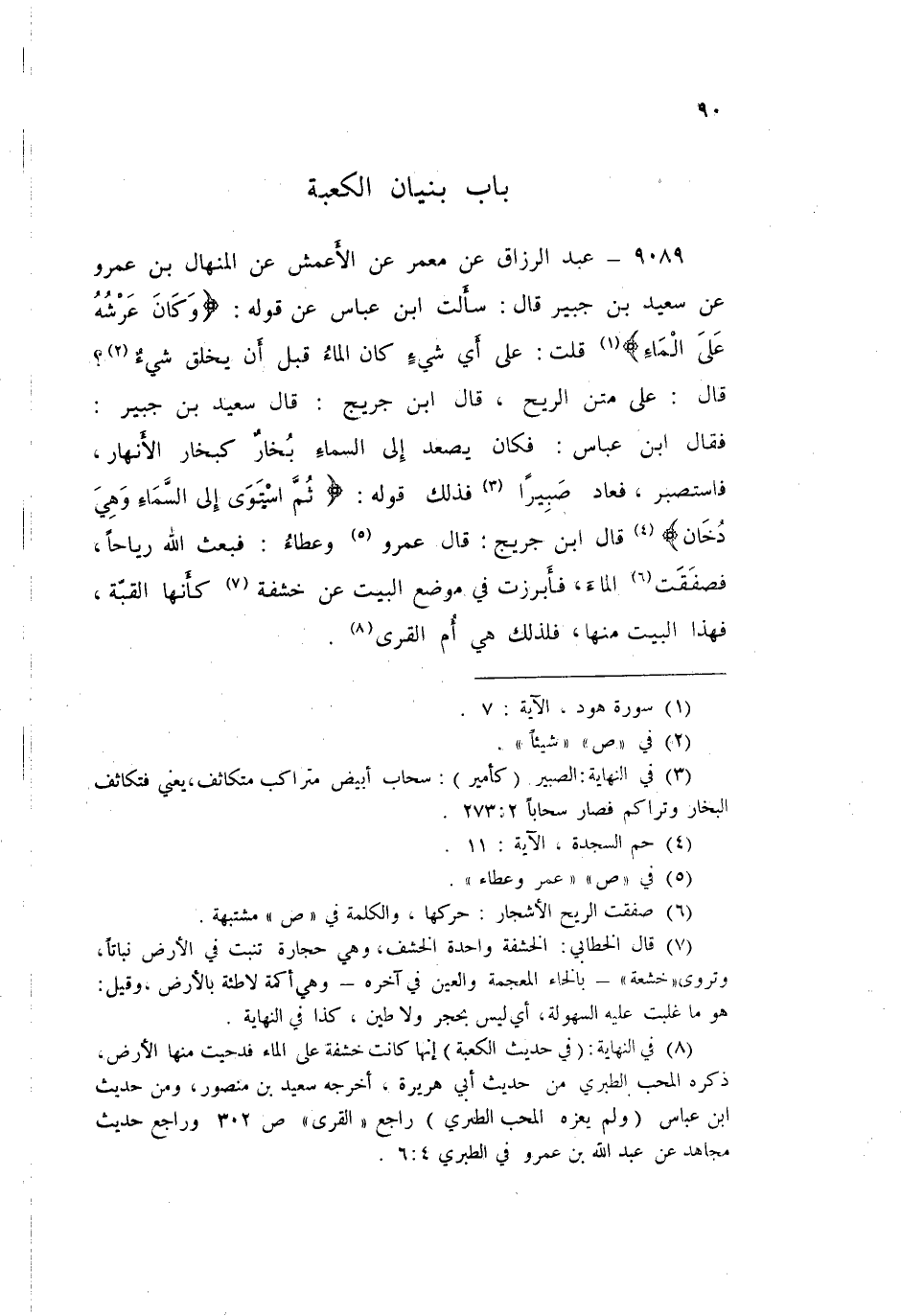٩٠٨٩ - عَنْ مَعْمَرٍ، عَنِ الْأَعْمَشِ، عَنِ الْمِنْهَالِ بْنِ عَمْرٍو، عَنْ سَعِيدِ بْنِ جُبَيْرٍ قَالَ: سَأَلْتُ ابْنَ عَبَّاسٍ عَنْ قَوْلِهِ: {وَكَانَ عَرْشُهُ عَلَى الْمَاءِ} [هود: ٧] قُلْتُ: " عَلَى أَيِّ شَىءٍ كَانَ الْمَاءُ قَبْلَ أَنْ يُخْلَقَ شَيْءٌ؟ قَالَ: عَلَى مَتْنِ الرِّيحِ "، قَالَ ابْنُ جُرَيْجٍ: قَالَ سَعِيدُ بْنُ جُبَيْرٍ: فَقَالَ ابْنُ عَبَّاسٍ: فَكَانَ يَصْعَدُ إِلَى السَّمَاءِ بُخَارٍ كَبُخَارِ الْأَنْهَارِ، فَاسْتَصْبَرَ، فَعَادَ صَبِيرًا، فَذَلِكَ قَوْلُهُ: {ثُمَّ اسْتَوَى إِلَى السَّمَاءِ وَهِيَ دُخَانٌ} [فصلت: ١١]. قَالَ ابْنُ جُرَيْجٍ: قَالَ عَمْرٌو، وَعَطَاءٌ: «فَبَعَثَ اللَّهُ رِيَاحًا فَصَفَقَتِ الْمَاءَ، فَأَبَرَزَتْ فِي مَوْضِعِ الْبَيْتِ عَنْ خَشَفَةٍ كَأَنَّهَا الْقُبَّةُ، فَهَذَا الْبَيْتُ مِنْهَا، فَلِذَلِكَ هِيَ أُمُّ الْقُرَى» ⦗٩١⦘ قَالَ ابْنُ جُرَيْجٍ: قَالَ عَطَاءٌ: «ثُمَّ وَتَّدَهَا اللَّهُ بِالْجِبَالِ كَيْلَا تُكْفَأَ» قَالَ: وَكَانَ أَوَّلَ جَبَلٍ أَبُو قُبَيْسٍ "