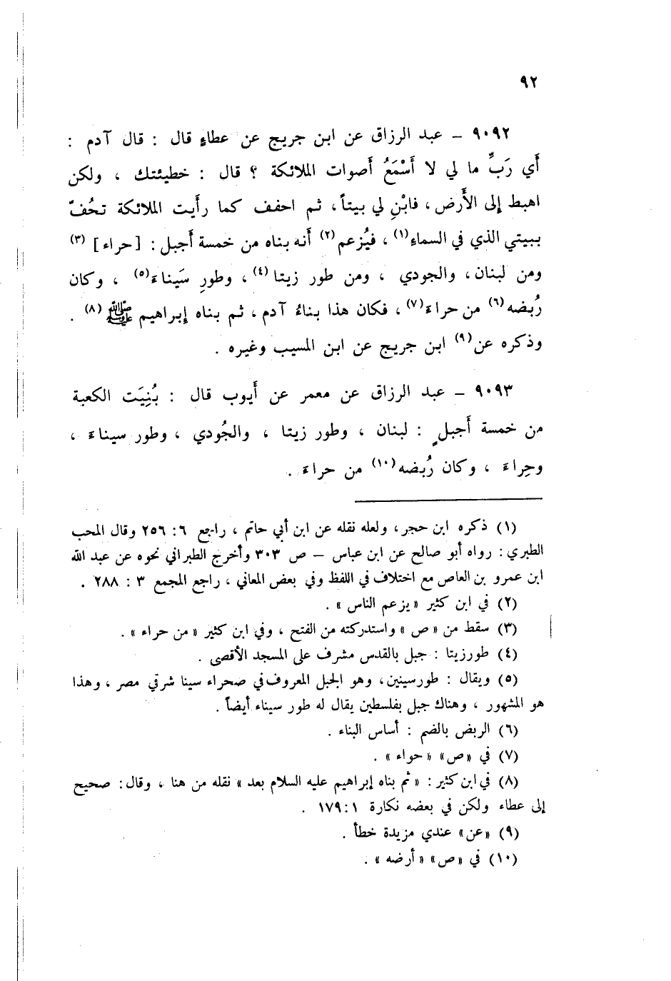 ٩٠٩٣ - عَنْ مَعُمَرٍ، عَنْ أَيُّوبَ قَالَ: " بُنِيَتِ الْكَعْبَةُ مِنْ خَمْسَةِ أَجْبُلٍ: لُبْنَانَ، وَطُورِ زِيتَا، وَالْجُودِيِّ، وَطُورِ سِينَاءَ، وَحِرَاءَ، وَكَانَ رُبْضُهُ مِنْ حِرَاءَ "
