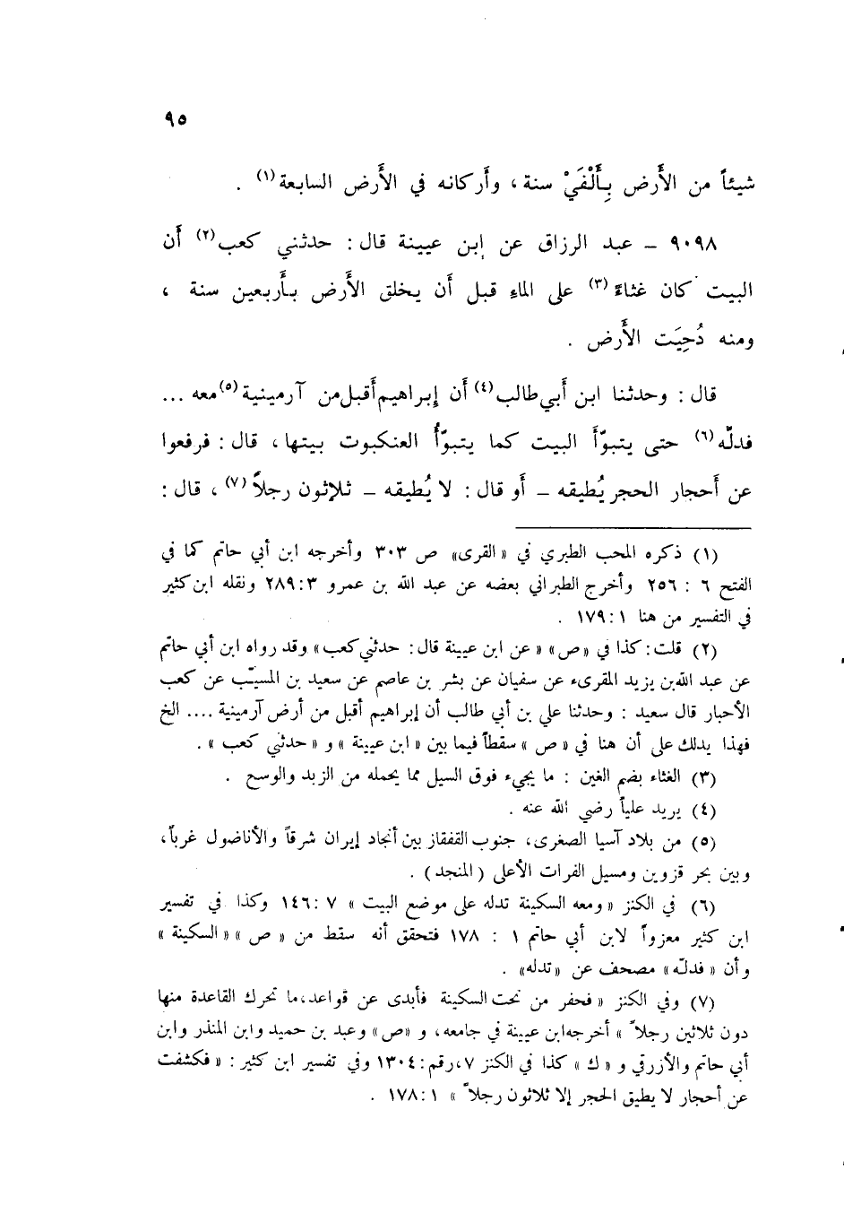 ٩٠٩٩ - عَنِ ابْنِ جُرَيْجٍ، قَالَ ابْنُ الْمُسَيِّبِ: قَالَ ابْنُ أَبِي طَالِبٍ: " وَكَانَ اللَّهُ اسْتَوْدَعَ الرُّكْنَ أَبَا قُبَيْسٍ فَلَمَّا أَتَى إِبْرَاهِيمُ نَادَاهُ أَبُو قُبَيْسٍ: يَا إِبْرَاهِيمُ، هَذَا الرُّكْنُ فِيَّ فَخُذْهُ، فَاحْتَفَرَ عَنْهُ فَوَضَعَهُ، فَلَمَّا فَرَغَ إِبْرَاهِيمُ مِنْ بِنَائِهِ. قَالَ: قَدْ فَعَلْنَا أَيْ رَبِّ فَأَرِنَا مَنَاسِكَنَا، أَبْرِزْهَا لَنَا، عَلِّمْنَاهَا، فَبَعَثَ اللَّهُ جِبْرِيلَ فَحَجَّ بِهِ، حَتَّى أَتَى عَرَفَةَ فَقَالَ: قَدْ عَرَفْتُ وَكَانَ قَدْ أَتَاهَا مَرَّةً قَبْلَ ذَلِكَ، فَلِذَلِكَ سُمِّيَتْ عَرَفَةَ، حَتَّى إِذَا كَانَ يَوْمُ النَّحْرِ، عَرَضَ لَهُ الشَّيْطَانُ فَقَالَ: احْصِبْ، فَحَصَبَ بِسَبْعِ حَصَيَاتٍ، ثُمَّ الْيَوْمُ الثَّانِي وَالثَّالِثُ، فَسَدَّ مَا بَيْنَ الْجَبَلَيْنِ، يَعْنِي إِبْلِيسَ الْمَلْعُونَ، فَلِذَلِكَ كَانَ رَمْيُ الْجِمَارِ قَالَ: اعْلُ عَلَى ثَبِيرٍ، فَعَلَاهُ فَنَادَى بِأَعْلَى صَوْتِهِ: يَا عِبَادَ اللَّهِ، أَجِيبُوا اللَّهَ، يَا عِبَادَ اللَّهِ، أَطِيعُوا اللَّهَ، فَسَمِعَ دَعْوَتَهُ مَا بَيْنَ الْأَبْحُرِ السَّبْعِ مِمَّنْ كَانَ فِي قَلْبِهِ مِثْقَالُ ذَرَّةٍ مِنْ إِيمَانٍ فَهُوَ الَّذِي أَعْطَاهُ اللَّهُ إِبْرَاهِيمَ فِي الْمَنَاسِكِ: قَوْلُهُ: «لَبَّيْكَ اللَّهُمَّ لَبَّيْكَ، اللَّهُمَّ لَبَّيْكَ لَبَّيْكَ» ⦗٩٧⦘ فَلَمْ يَزَلْ عَلَى وَجْهِ الْأَرْضِ سَبْعَةٌ مُسْلِمُونَ فَصَاعِدًا فَلَوْلَا ذَلِكَ هَلَكَتِ الْأَرْضُ وَمَنْ عَلَيْهَا " قَالَ ابْنُ جُرَيْجٍ: وَأَمَّا مُجَاهِدٌ، فَقَالَ: " عَلَا إِبْرَاهِيمُ مَقَامَهُ، فَقَالَ: يَا عِبَادَ اللَّهِ أَجِيبُوا اللَّهَ، يَا عِبَادَ اللَّهِ أَطِيعُوا اللَّهَ، فَمَنْ حَجَّ الْيَوْمَ فَهُوَ مِمَّنِ اسْتَجَابَ لِإِبْرَاهِيمَ يَوْمَئِذٍ فَهِيَ الَّتِي أَعْطَاهَا اللَّهُ إِبْرَاهِيمَ فِي الْمَنَاسِكِ قَوْلُهُ: لَبَّيْكَ اللَّهُمَّ لَبَّيْكَ، ثُمَّ بَنَاهُ إِبْرَاهِيمُ
