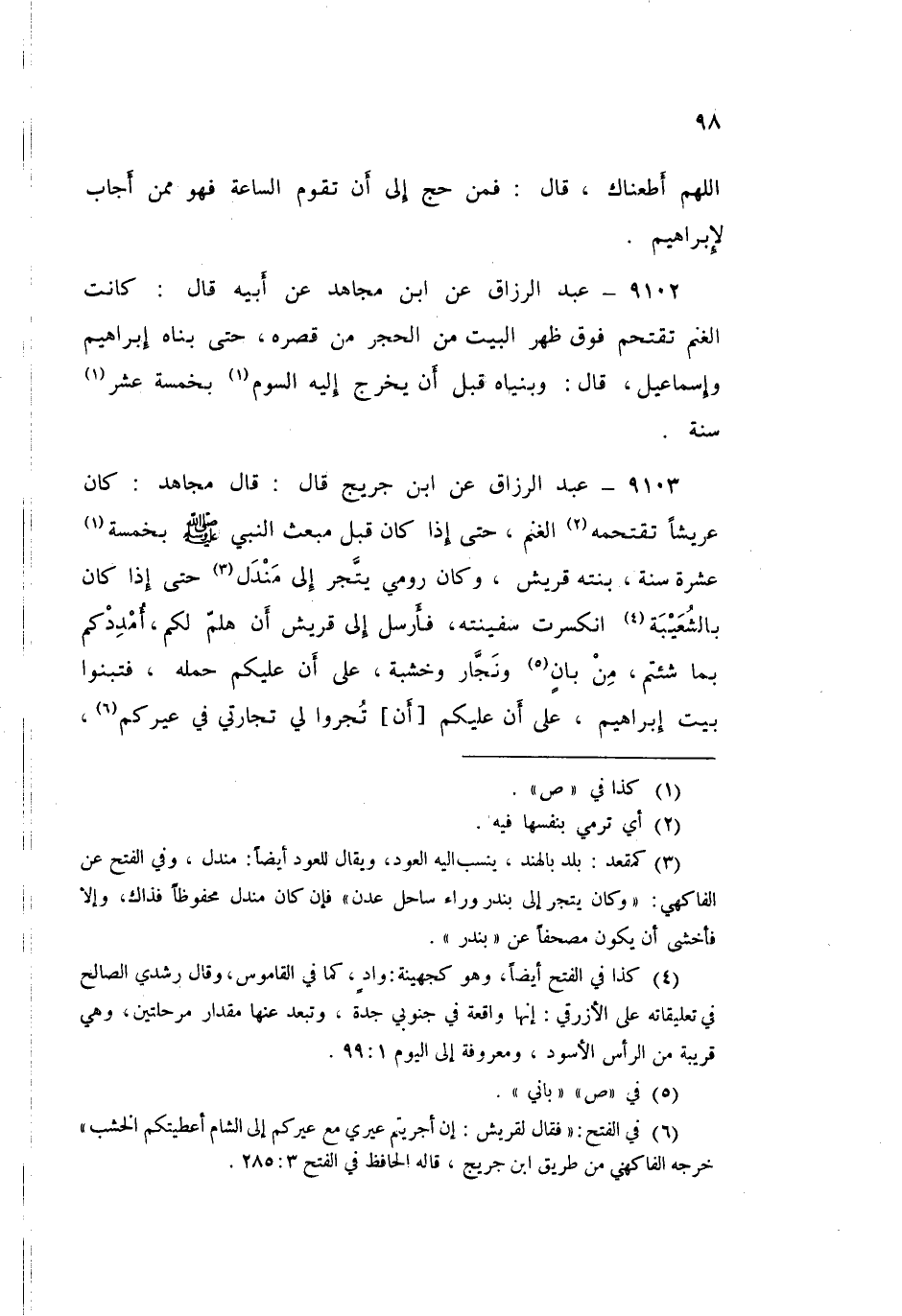 ٩١٠٣ - عَنِ ابْنِ جُرَيْجٍ قَالَ: قَالَ مُجَاهِدٌ: كَانَ عَرِيشًا تَقْتَحِمُهُ الْغَنَمُ حَتَّى إِذَا كَانَ قَبْلَ مَبْعَثِ النَّبِيِّ صَلَّى اللهُ عَلَيْهِ وَسَلَّمَ بِخَمْسَ عَشْرَةَ سَنَةً، بَنَتْهُ قُرَيْشٌ، وَكَانَ رُومِيُّ يَتَّجِرُ إِلَى مَنْدَلٍ حَتَّى إِذَا كَانَ بِالشُّعَيْبَةِ انْكَسَرَتْ سَفِينَتُهُ، فَأَرْسَلَ إِلَى قُرَيْشٍ: أَنْ هَلُمَّ لَكُمْ أُمْدِدْكُمْ بِمَا شِئْتُمْ مِنْ بَانٍ وَنَجَّارٍ وَخَشَبَةٍ، عَلَى أَنَّ عَلَيْكُمْ حَمْلَهُ، فَتَبْنُوا بَيْتَ إِبْرَاهِيمَ، عَلَى أَنَّ عَلَيْكُمْ أَنْ تُجْرُوا لِي تِجَارَتِي فِي عِيرِكُمْ ⦗٩٩⦘، وَكَانَ لِقُرَيْشٍ رِحْلَتَانِ فِي كُلِّ عَامٍ، أَمَّا فِي الشِّتَاءِ فَإِلَى الشَّامِ، وَأَمَّا فِي الصَّيْفِ فَإِلَى الْحَبَشَةِ قَالُوا: نَعَمْ، وَكَانَ فِي الْبَيْتِ بِئْرٌ تَكُونُ فِيهِ الْحِلْيَةُ وَالْهَدِيَّةُ، فَكَانَتْ قُرَيْشُ تَرْتَضِي لِذَلِكَ رَجُلًا، فَيَكُونُ عَلَى تِلْكَ الْبِئْرِ، وَمَا فِيهَا فَبَيْنَا رَجُلٌ كَانَ مِمَّنْ يُرْتَضَى لَهَا، سَوَّلَتْ لَهُ نَفْسُهُ أَنْ يَخْتَانَ، فَنَظَرَ حَتَّى إِذَا انْقَطَعَتِ الظِّلَالُ، وَارْتَفَعَتِ الْمَجَالِسُ، بَسَطَ ثَوْبَهُ، ثُمَّ نَزَلَ فِيهَا، فَأَخَذَ ثُمَّ الثَّانِيَةُ ثُمَّ الثَّالِثَةُ، فَقَضَّ اللَّهُ عَلَيْهِ حَجَرًا فِيهَا فَحَبَسَهُ فِيهَا. . . رَأْسُهُ أَسْفَلُهُ، فَرَاحَ النَّاسُ فَأَخَرَجُوهُ فَأَعَادَ مَا كَانَ أَخَرَجَ مِنْهَا، فَبَعَثَ اللَّهُ ثُعْبَانًا، فَأَسْكَنَهُ إِيَّاهَا، فَكَانَ إِذَا أَحَسَّ عِنْدَ الْبَابِ حِسًّا أَطْلَعَ رَأْسَهُ، فَلَا يَقْرَبُهُ خَلْقٌ مِنْ خَلْقِ اللَّهِ، فَلَمَّا حَضَرَ الْقَوْمُ حَاجَتَهُمْ قَالُوا: كَيْفَ بِالدَّابَةِ الَّتِي فِي الْبَيْتِ "، فَقَالَ الْوَلِيدُ بْنُ الْمُغِيرَةِ: اجْتَمِعُوا فَادْعُوا رَبَّكُمْ، فَإِنْ تَكُنِ الَّذِي ائْتَمَرْتُمْ للَّهِ رِضًى، فَهُوَ كَافِيكُمُوهُ، وَإِلَّا فَلَا تَسْتَطِيعُونَهَا قَالَ: فَدَعَوُا اللَّهَ فَبَعَثَ اللَّهُ طَائِرًا فَدَفَّ عَلَى الْبَابِ، فَلَمَّا أَحَسَّتْهُ الْحَيَّةُ أَطْلَعَتْ رَأْسَهَا، فَخَطَفَهَا فَذَهَبَ بِهَا كَأَنَّهَا خَشَبَةٌ يَقُولُ: كَأَنَّهَا تَظُنُّهُ لَا يَكَادُ حَمَلَهَا حَتَّى وَعَلَا سُلَّمًا كَانَتْ بِمَكَّةَ فَلَمْ تُرَ بَعْدُ، وَبَنَتْ قُرَيْشٌ، فَلَمَّا جَاءَ ⦗١٠٠⦘ مَوْضِعُ الرُّكْنِ تَحَاسَرَتِ الْقَبَائِلُ، فَقَالَتْ هَذِهِ الْقَبِيلَةُ: نَحْنُ نَرْفَعُهُ، وَقَالَتْ هَذِهِ الْقَبِيلَةُ: نَحْنُ نَرْفَعُهُ قَالُوا: فَأَوَّلُ رَجُلٍ يَدْخُلُ مِنْ هَذَا الْبَابِ الْأَعْلَى يَقْضِي بَيْنَنَا، فَدَخَلَ مُحَمَّدٌ صَلَّى اللهُ عَلَيْهِ وَسَلَّمَ فَقَالُوا: يَا مُحَمَّدُ اقْضِ بَيْنَنَا، فَقَالَ: «ضَعُوا ثَوْبًا ثُمَّ ضَعُوهُ فِيهِ، ثُمَّ يَأْخُذُهُ مِنْ كُلِّ قَبِيلَةٍ رَجُلٌ» فَفَعَلُوا وَأَخَذَ هُوَ الرُّكْنَ فَجَعَلَ يَدَهُ تَحْتَدُّ فَكَانَ هُوَ الَّذِي رَفَعَهُ مَعَهُمْ حَتَّى وَضَعَهُ مَعَهُمْ مَوْضِعَهُ الْآنَ