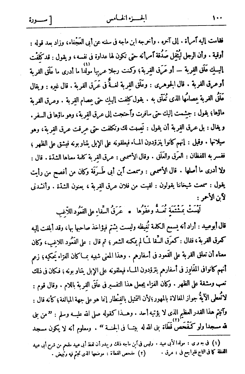 قَالَ أَبُو عُبَيْدٍ: أَرَادَ أَنَّهُ يسمع الكلمة تغيظه وليست بشتم فيؤاخذ صَاحِبُهَا بِهَا، وَقَدْ أَبْلَغْتُ إِلَيْهِ كَعَرَقِ الْقِرْبَةِ، فقال: كعرق السقاء لَمَّا لَمْ يُمْكِنْهُ الشِّعْرُ، ثُمَّ قَالَ: عَلَى الْقَعُودِ اللَّاغِبِ، وَكَانَ مَعْنَاهُ أَنَّ تُعَلَّقَ الْقِرْبَةُ عَلَى الْقَعُودِ فِي أَسْفَارِهِمْ. وَهَذَا الْمَعْنَى شَبِيهٌ بِمَا كَانَ الْفَرَّاءُ يَحْكِيهِ، زَعَمَ أَنَّهُمْ كَانُوا فِي الْمَفَاوِزِ فِي أَسْفَارِهِمْ يَتَزَوَّدُونَ الْمَاءَ فَيُعَلِّقُونَهُ عَلَى الْإِبِلِ يَتَنَاوَبُونَهُ، فَكَانَ فِي ذَلِكَ تَعَبٌ وَمَشَقَّةٌ عَلَى الظَّهْرِ. وَكَانَ الْفَرَّاءُ يَجْعَلُ هَذَا التَّفْسِيرَ فِي عَلَقِ الْقِرْبَةِ بِاللَّامِ. وَقَالَ قَوْمٌ: لَا تُعْطِي الْآيَةُ جَوَازَ الْمُغَالَاةِ بِالْمُهُورِ، لِأَنَّ التَّمْثِيلَ بِالْقِنْطَارِ إِنَّمَا هُوَ عَلَى جِهَةِ الْمُبَالَغَةِ، كَأَنَّهُ قَالَ: وَآتَيْتُمْ هَذَا الْقَدْرَ الْعَظِيمَ الَّذِي لَا يُؤْتِيهِ أَحَدٌ. وَهَذَا كَقَوْلِهِ صَلَّى اللَّهُ عَلَيْهِ وَسَلَّمَ: (مَنْ بَنَى لِلَّهِ مَسْجِدًا وَلَوْ كَمَفْحَصِ «٢» قَطَاةٍ بَنَى اللَّهُ لَهُ بَيْتًا فِي الجنة). ومعلوم أنه لا يكون مسجد